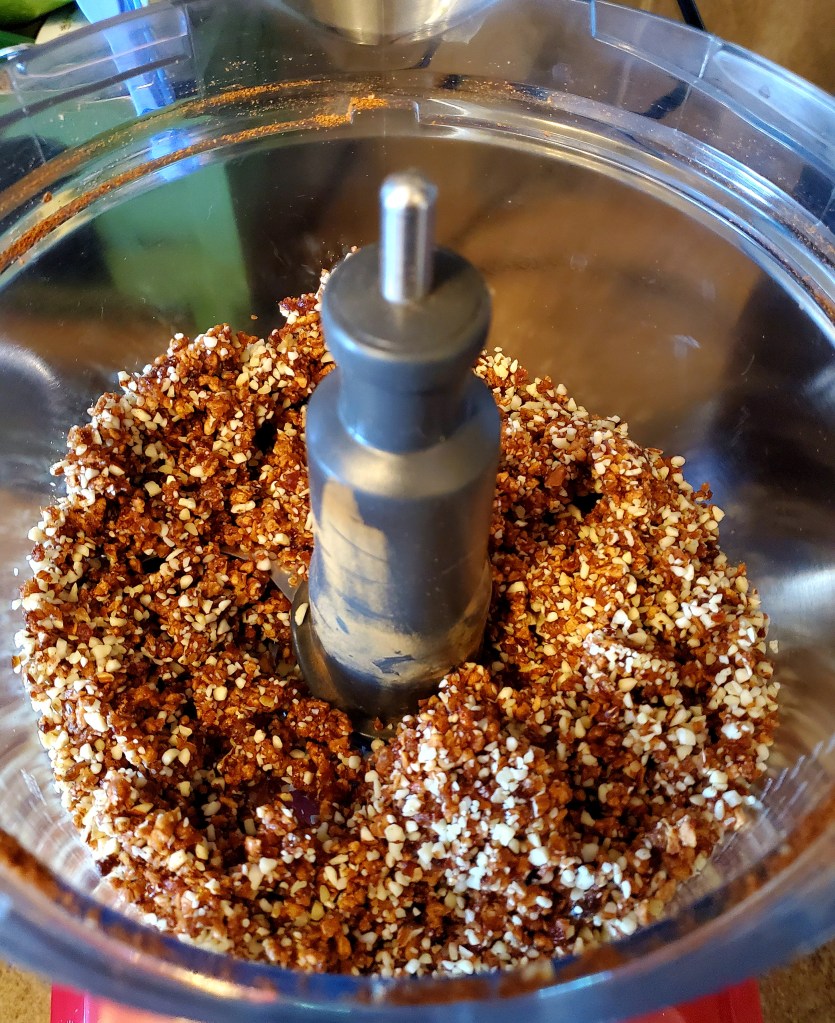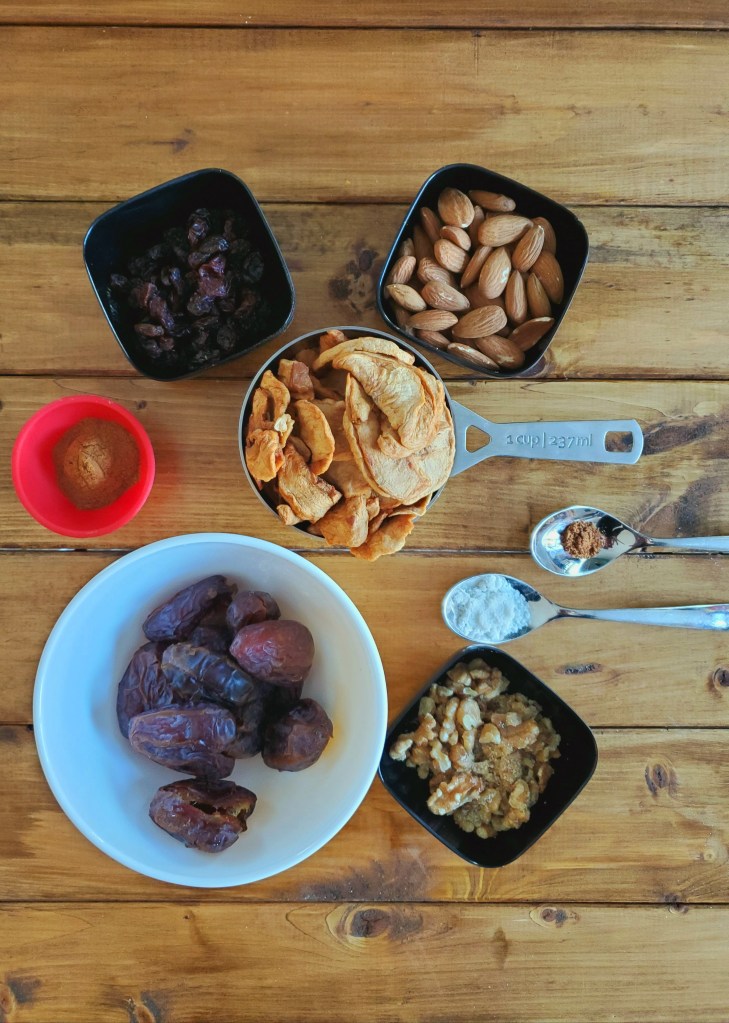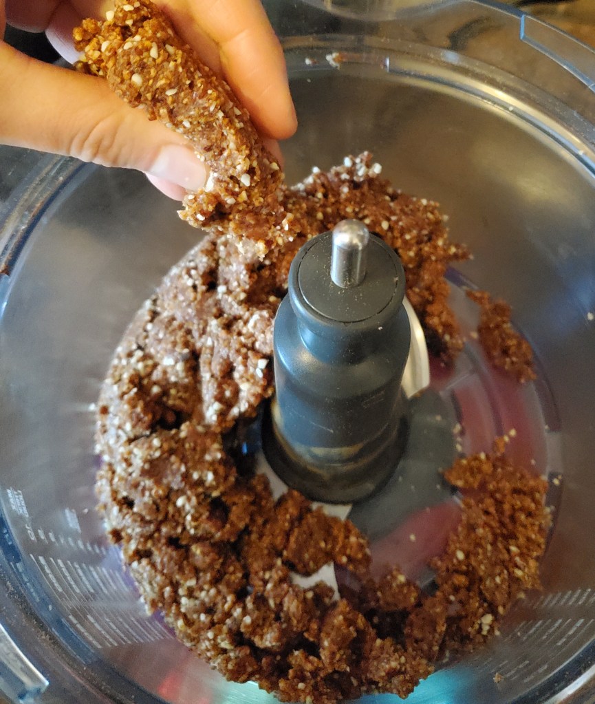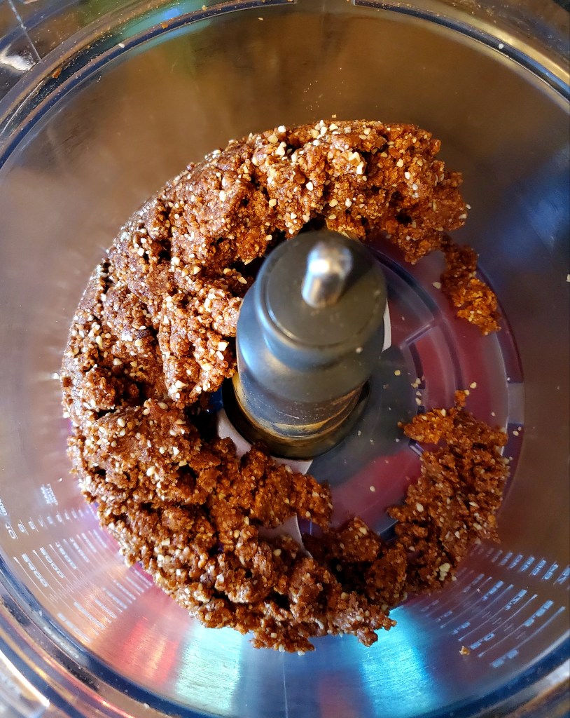 To a food processor, add all of the ingredients and begin to pulse until the fruit starts to get broken up. Run the the machine for about 1 -2 minute until mixture starts to come together, it will first look like wet sand then it will start to clump together and hold its shape. It is also important not to over process this mixture to the point where the oils separate and it becomes a little messy. Once the dough reaches the right consistency you will then shape it into bite sized balls or press into a parchment lined 8 by 8 baking dish and cut into bars.