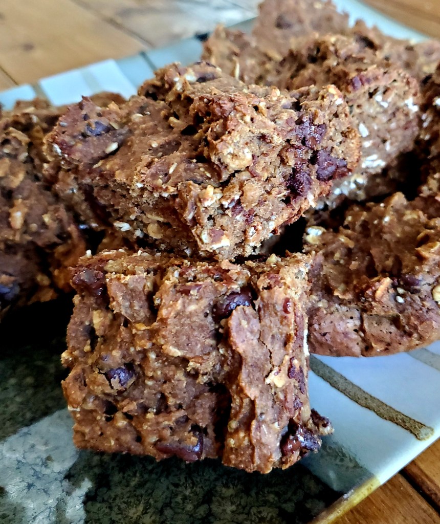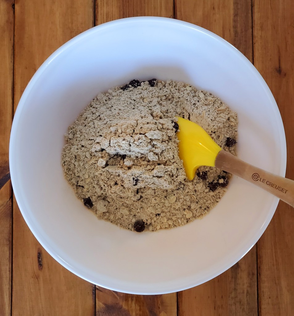 In a medium bowl, whisk the oat flour, oats, protein powder, coconut, ground flax seed, chocolate chips, cacao nibs (if using), chia, hemp, baking soda, baking powder, salt, cinnamon, and nutmeg. Whisk until completely combined, set aside.
