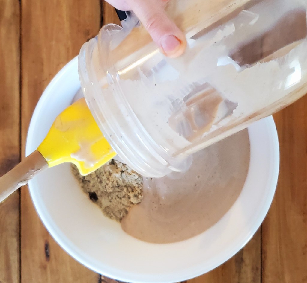 In a blender, add all remaining wet ingredients, plant milk, nuts, dates, maple, banana, vinegar, and vanilla. Blend until completely smooth, it may even feel a little bit warm, that’s a good thing!