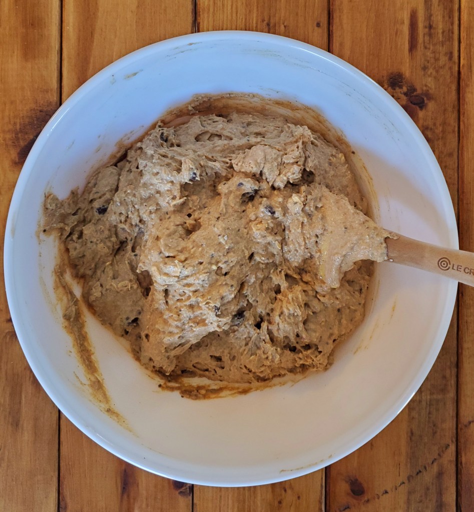 Add the wet ingredients to the dry and gently fold the mixture with a rubber spatula or spoon until completely combined.