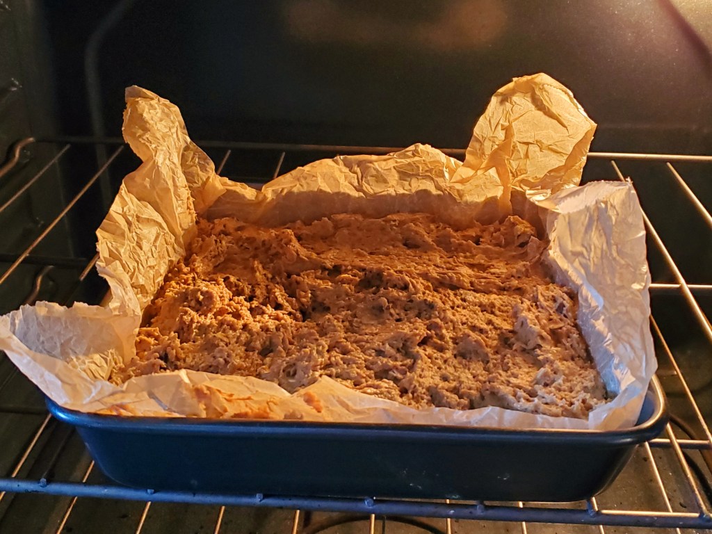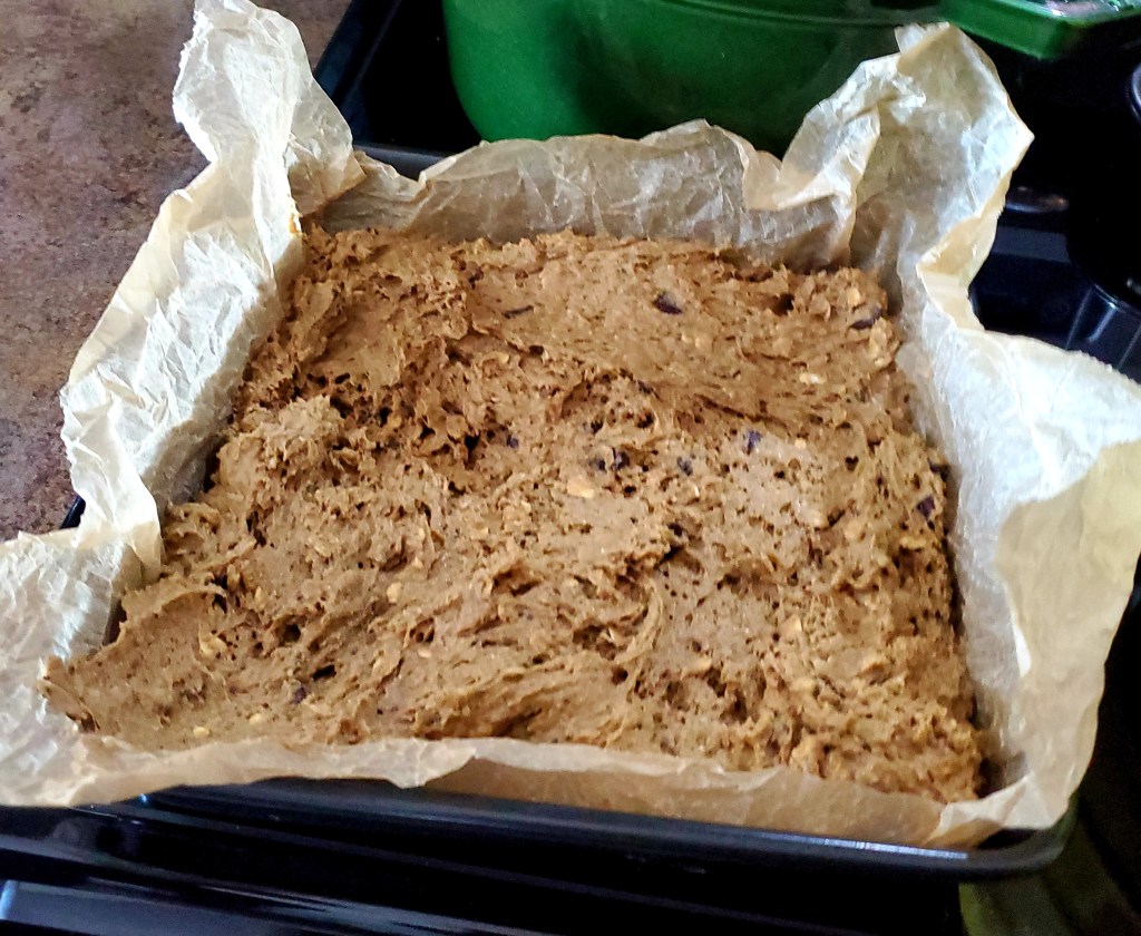 Pour the mixture into prepared baking pan and use a rubber spatula or spoon to spread the mix evenly out into the pan, this will assure it bakes as evenly as possible.