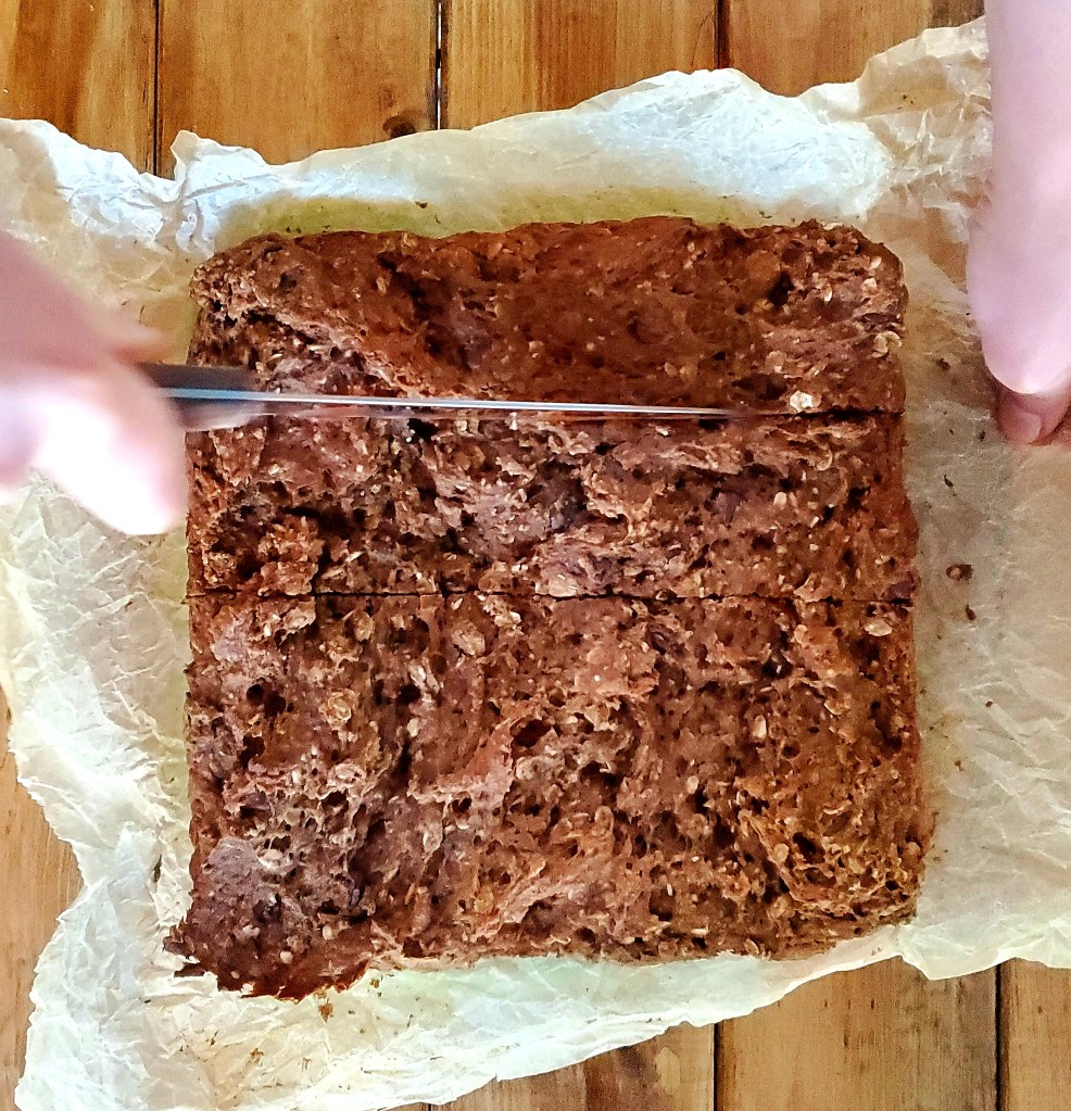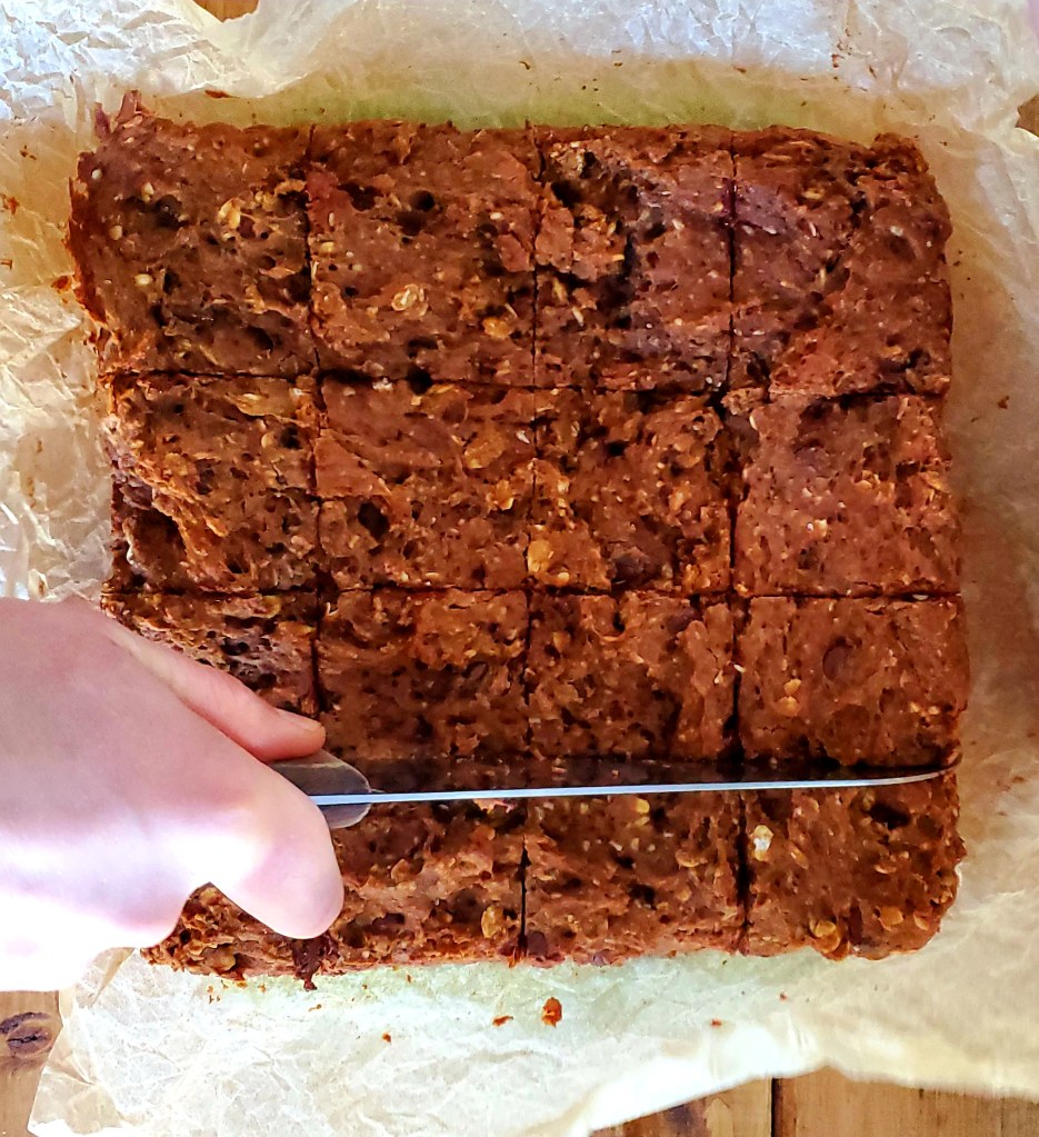 Once cooled, place the bars on a cutting board and cut into desired shapes and sizes. Store in a sealed container in the fridge for 2 weeks or freeze up to 6 months. These bars can also sit at room temperature but they wont last as long. Enjoy as a pre/post workout or just as a quick snack!
