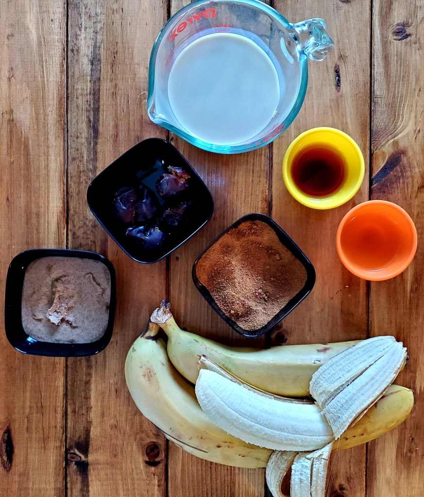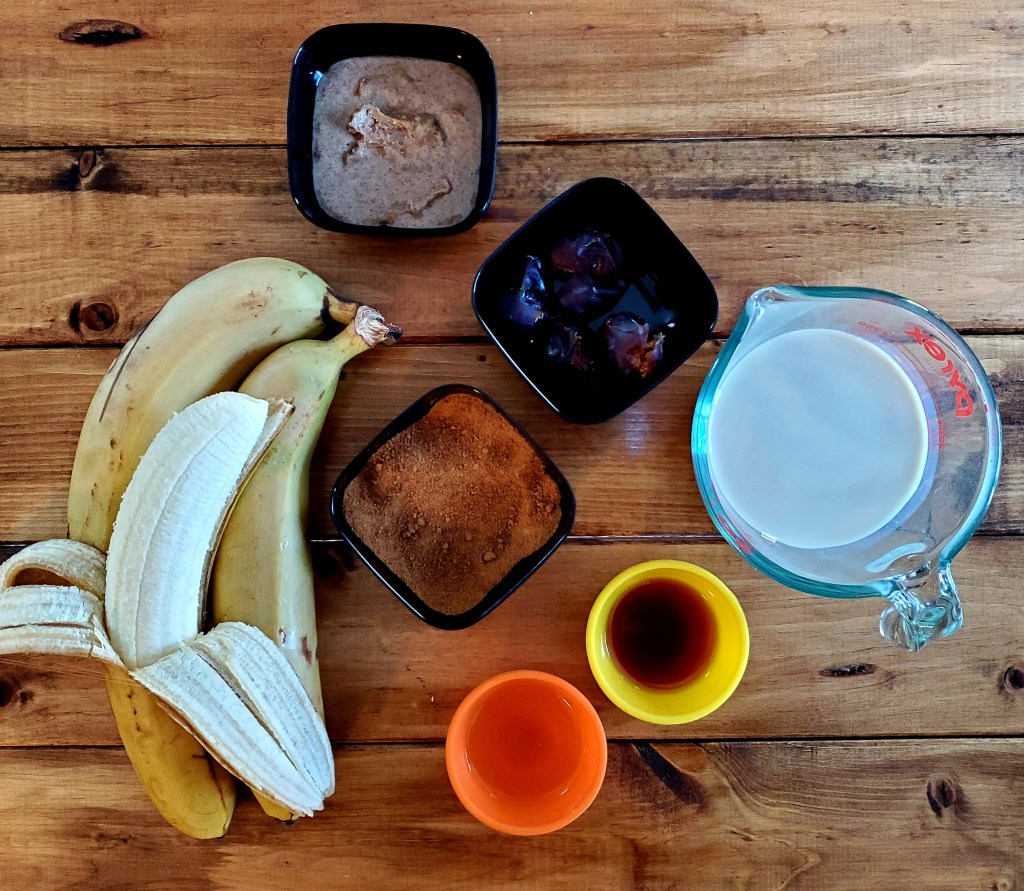 In a blender, add plant milk mixture, bananas, coconut sugar, dates, nut butter, and vanilla. Blend until fully smooth and slightly warm. Stir in the chia seeds until fully incorporated.