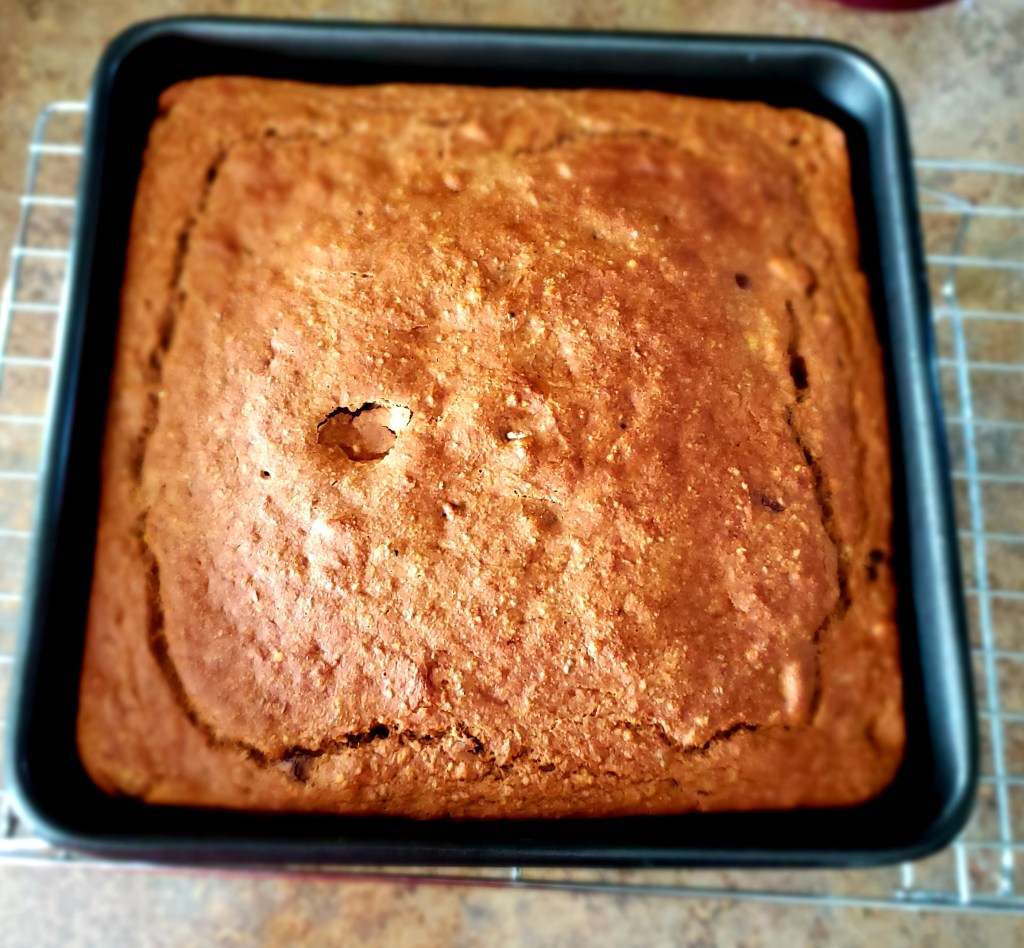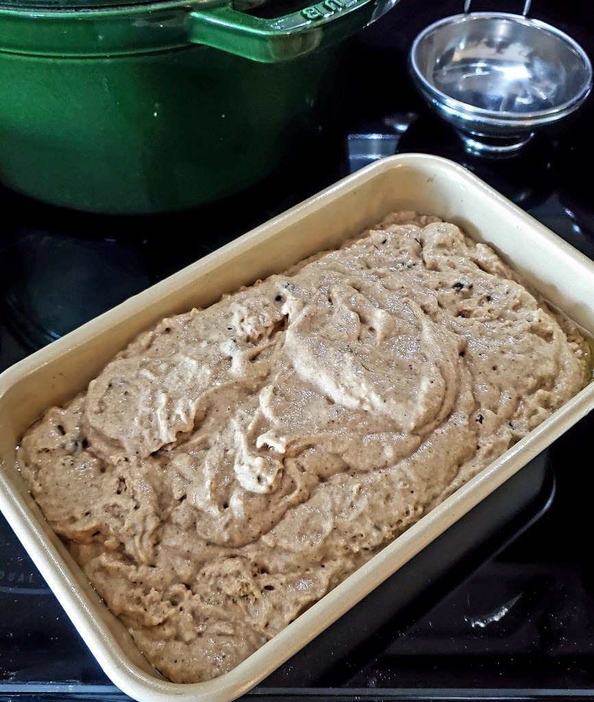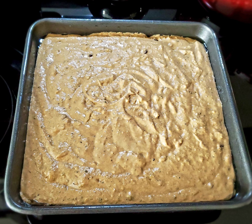 Pour into prepared baking pan and spread the batter out so that it is evenly distributed for baking.