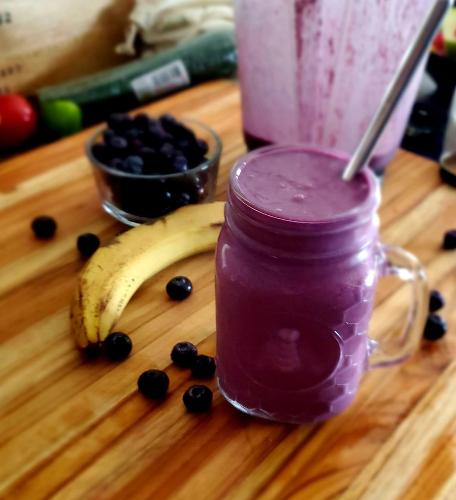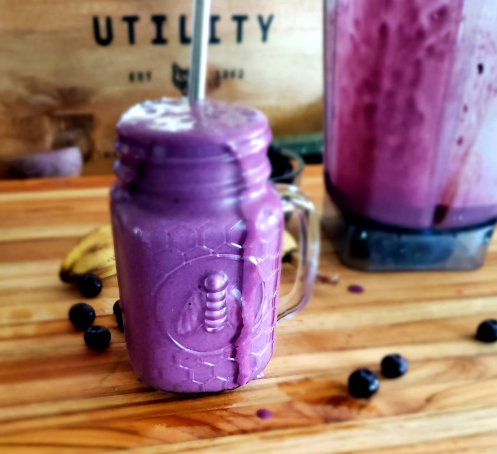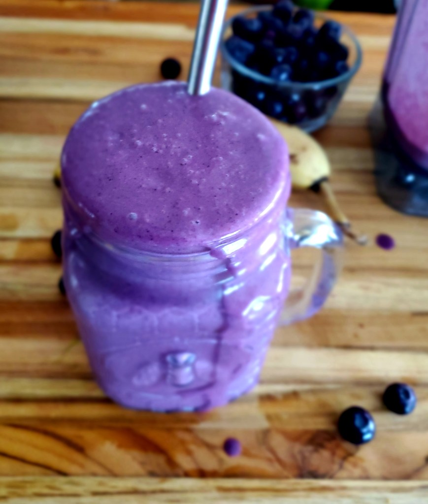 The cashew butter makes this shake extra special. Blueberries are interchangeable with whatever berry you like. I quite enjoy strawberries or peaches. For more of a milkshake consistency, this recipe works best with a frozen banana and frozen berries.