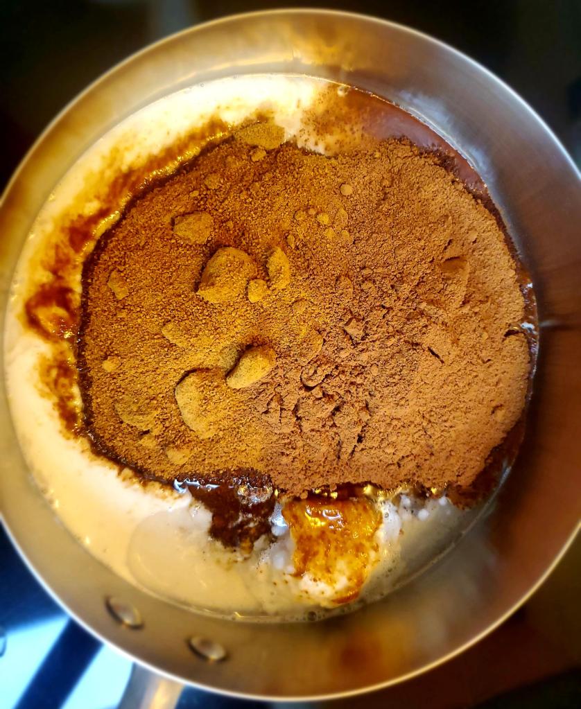 Combine sugar, coconut milk, oil, and cacao powder in a medium saucepan over medium low heat.