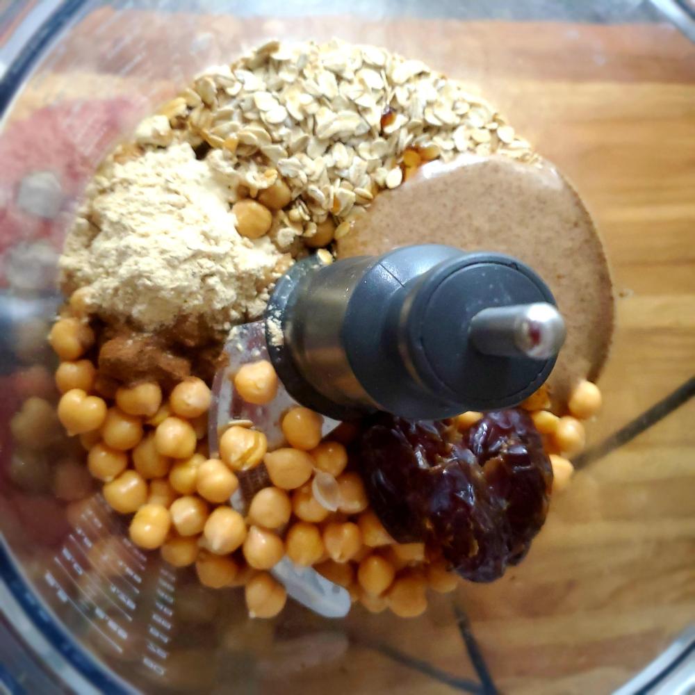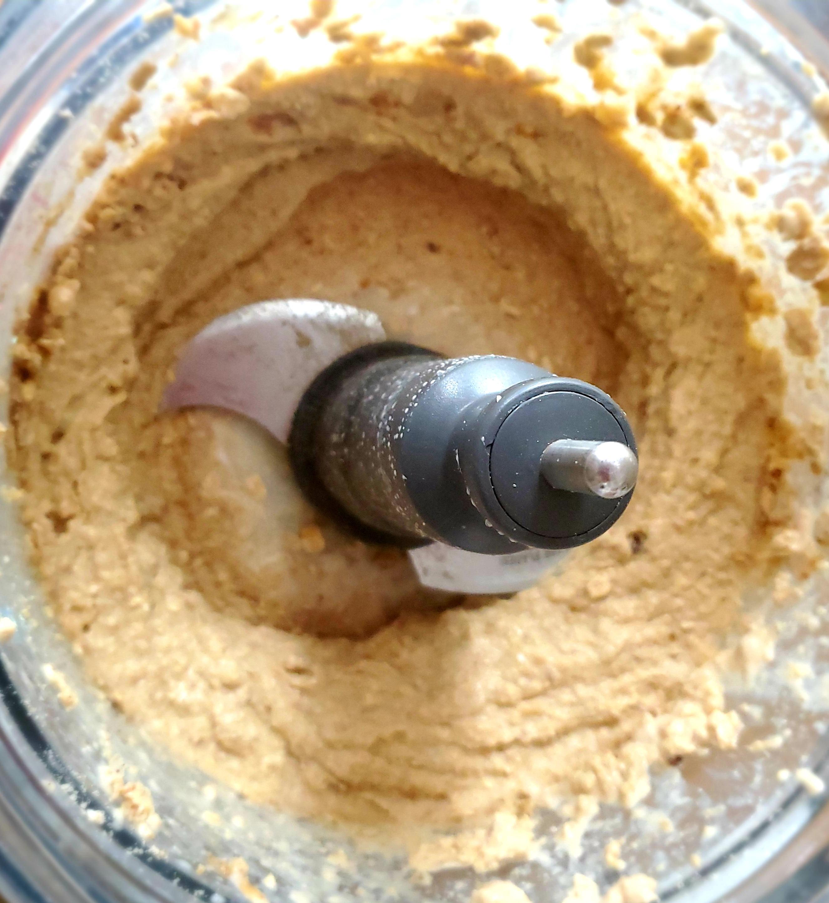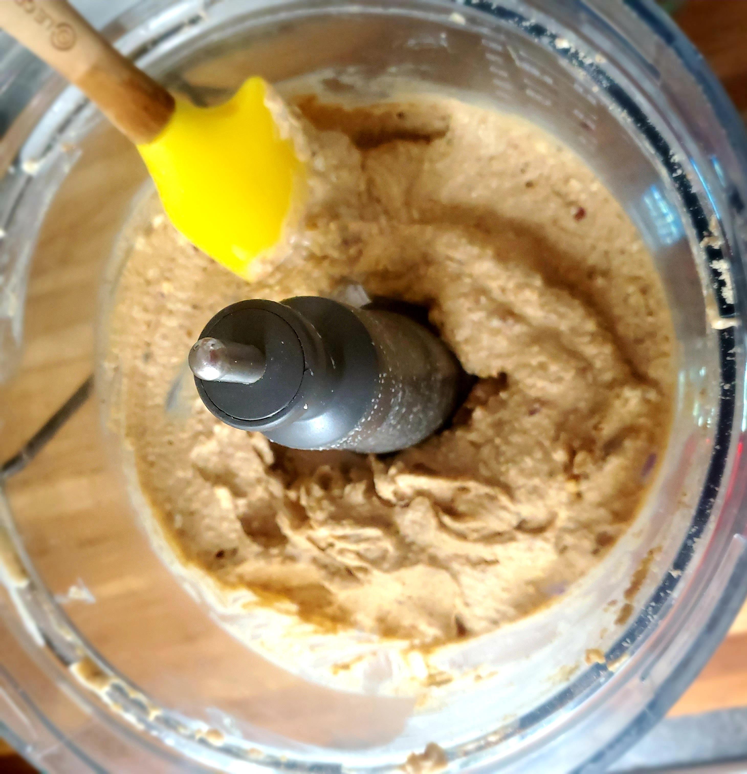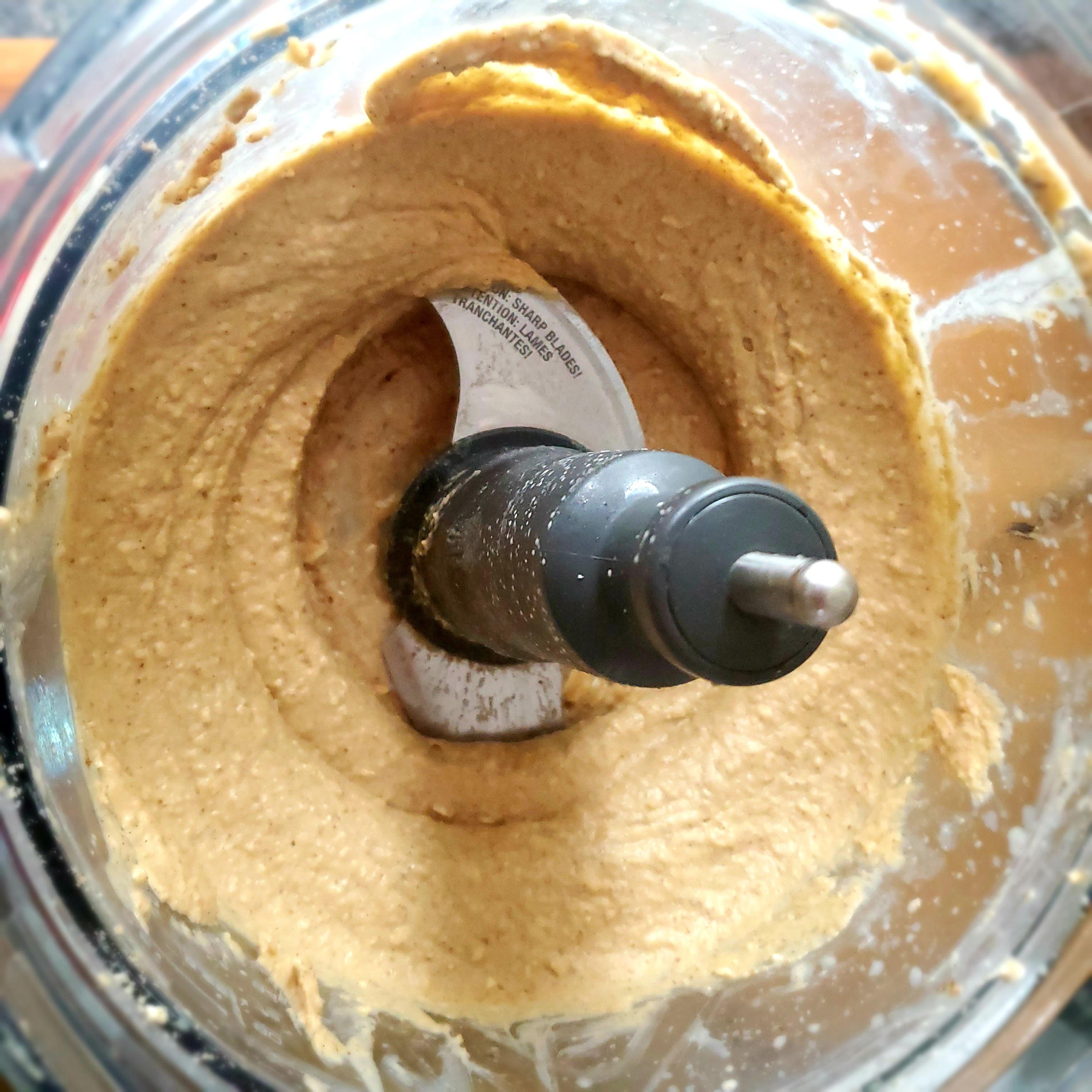 Pules the machine a few times to get everything going. Let the processor run for 30-45 seconds, adding in up to 5 tbsp of reserved date water while the machine is running. Blend until everything starts to look smooth and creamy.