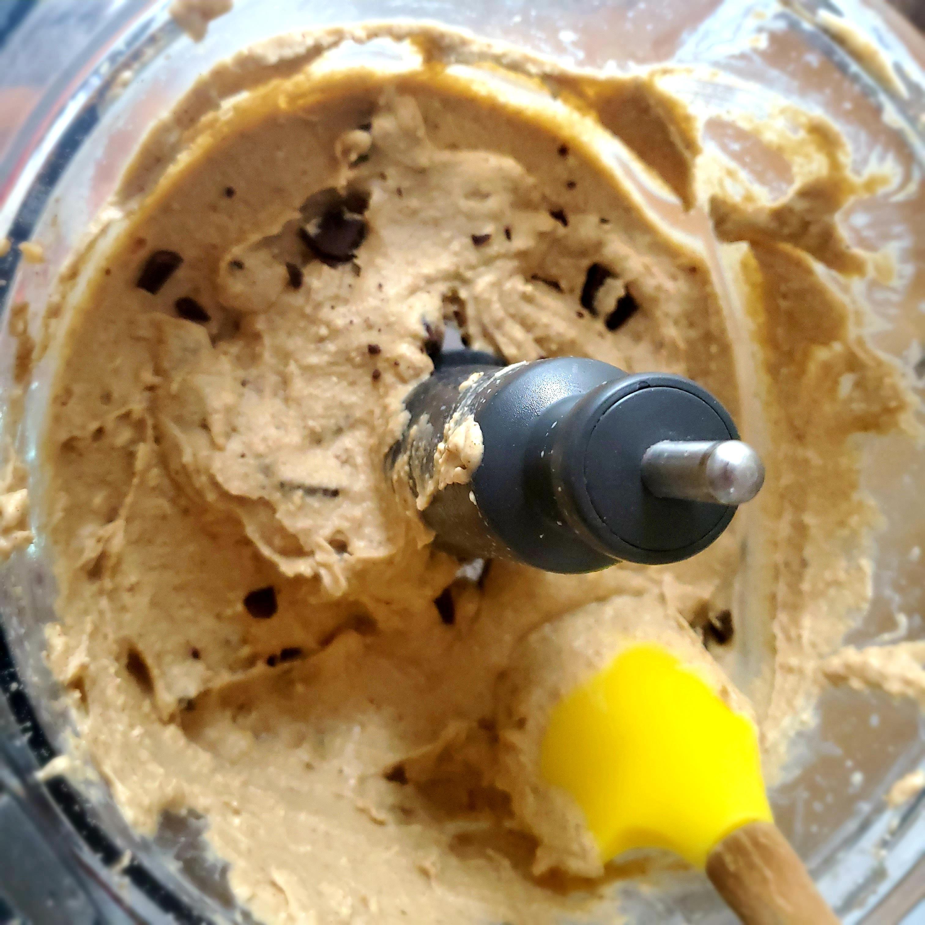 Stop the processor and scrape down the sides of the bowl to make sure everything gets incorporated. Continue to run the machine for another 45-60 seconds. You don’t want to process or blend for too long incase the mixture starts to heat up too much. This could cause the chocolate chips to melt into the batter. Not a bad thing, just not the aesthetic we’re going for.