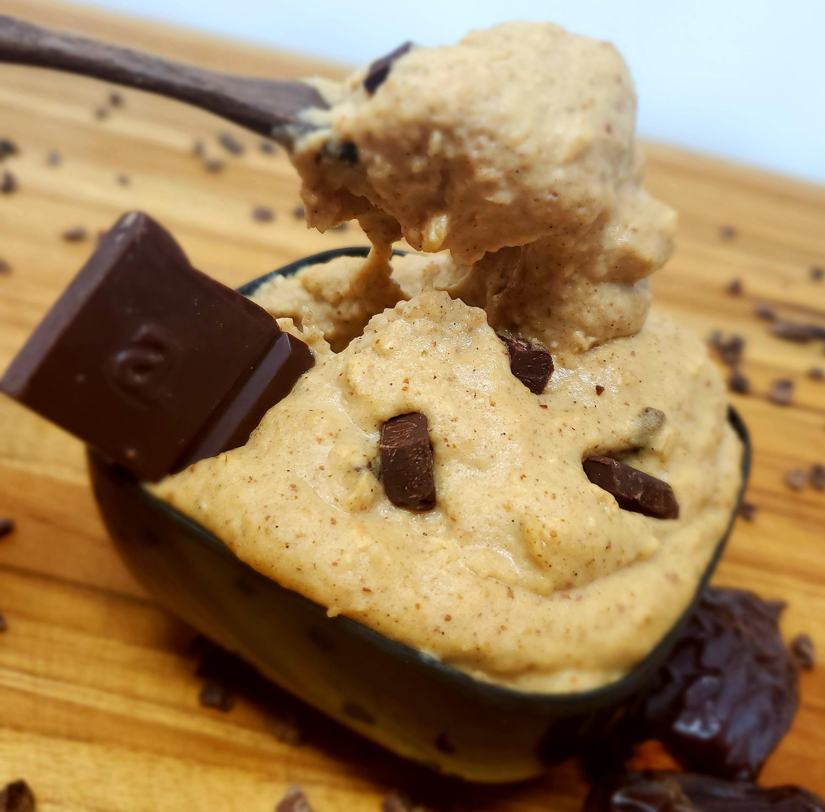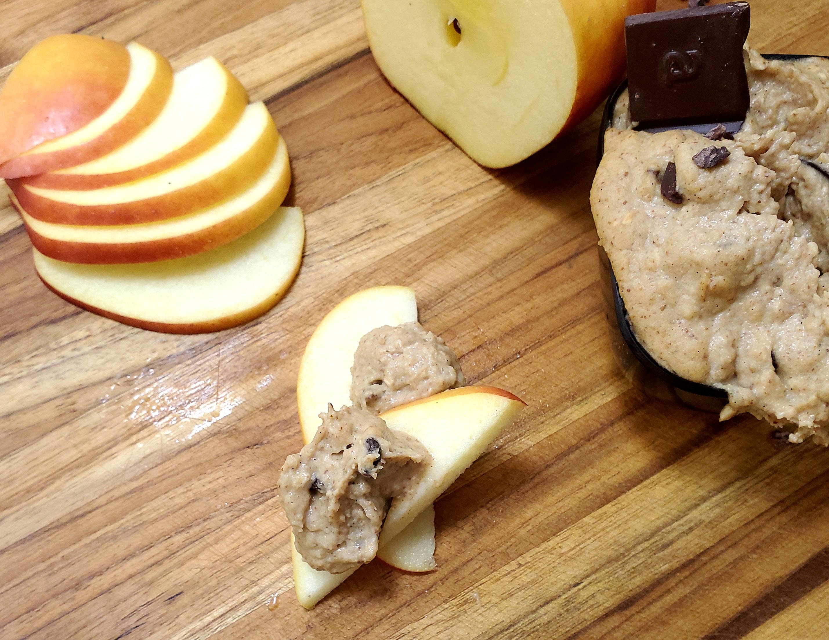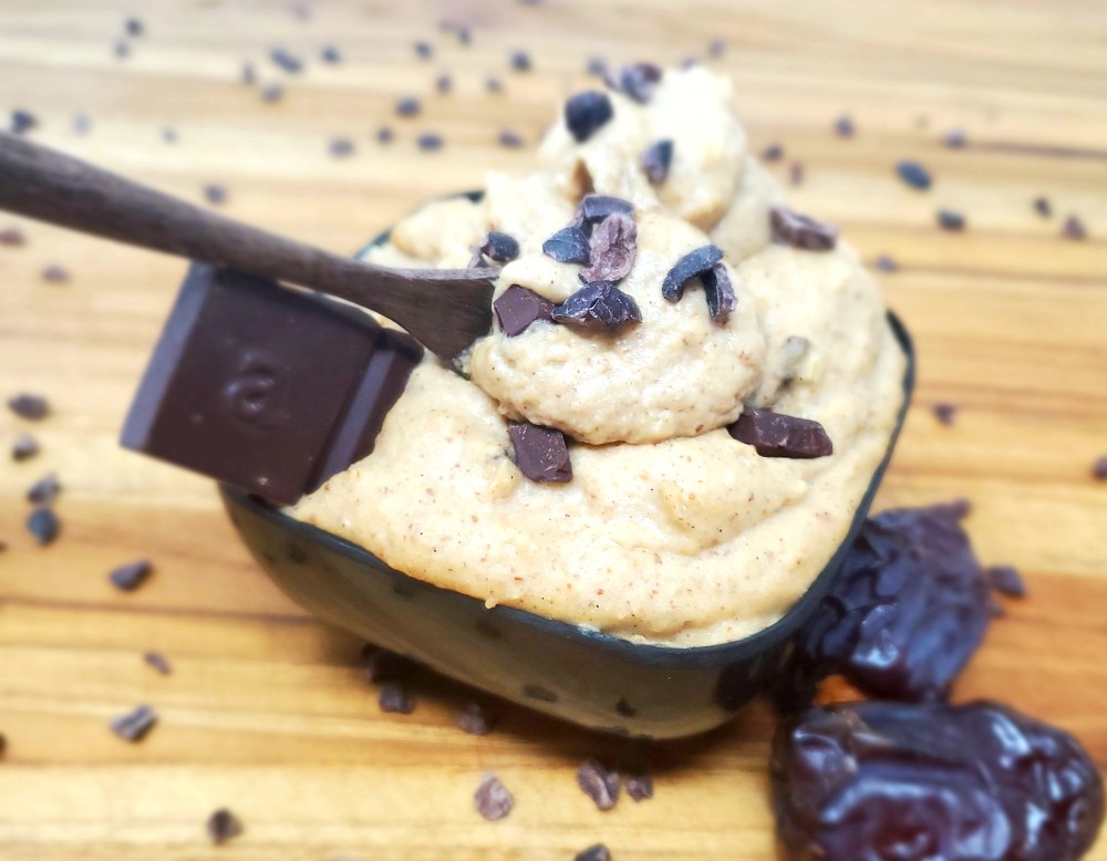 Is it cookie dough or hummus? Dip or a spread? The answer is, all of the above and then some. Yes, this is technically a dessert hummus and not an actual cookie dough. However, it tastes just like it. When I make this I usually double or triple the recipe so it lasts me the entire work week. In my experience, making double or more allows the dip to mix a bit more evenly as my food processor is quite large. Those who have a smaller processor or blender, perhaps a bullet blender, may find that a single recipe blends very well. This will of course vary depending on what blender or processor you have. Like I said, this recipe is not an actual dough therefore it is not meant to be baked in an oven. Think of this as a deliciously sweet dip, spread, or just a simple dessert to eat as is with a spoon. High in protein due to the combination of the chickpeas and protein powder, this treat will leave you feeling satiated for a long time. If using protein powder, keep in mind that flavors vary and some brands tend to be very sweet. If that’s the case, adjust the sweetness with your maple syrup using less or none at all. Using unflavored protein is also an option. You can also completely leave out the protein powder if you’d like. Just make sure you decrease the amount of date water you add by at least half. This recipe works great with almond, cashew, and walnut butters. If you have a nut allergy feel free to sub your favorite seed butters.