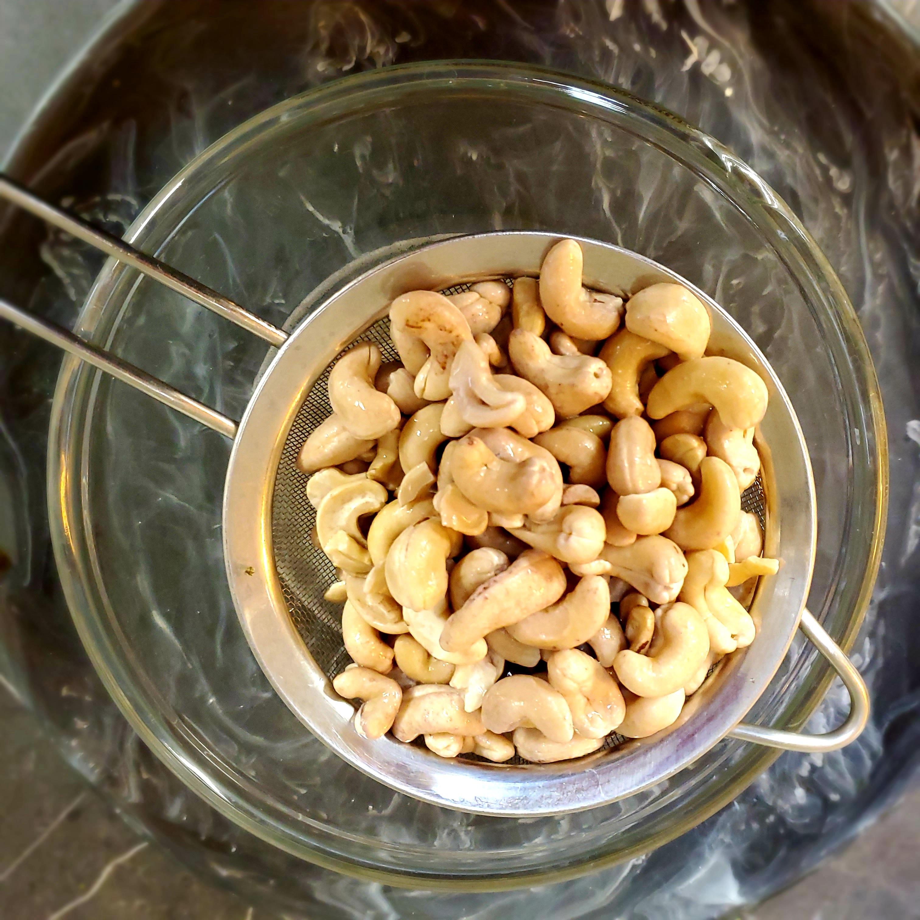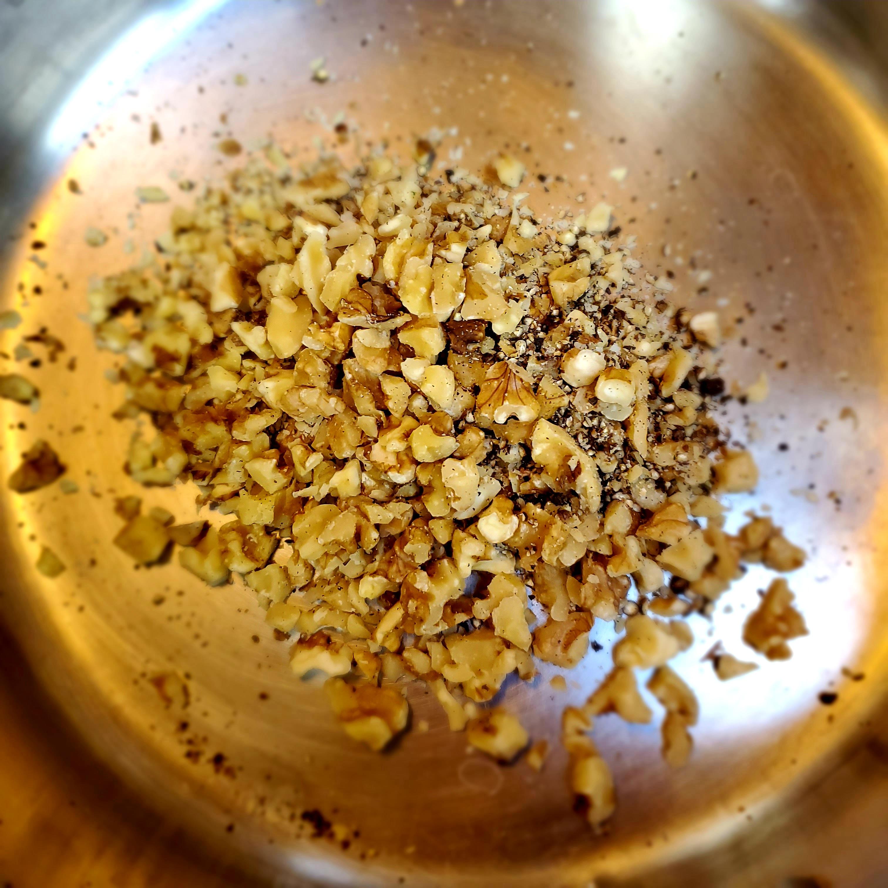 While the cheeze is setting in the fridge make the crust. In a shallow frying pan, toast walnuts and black pepper over medium heat. Toast for 1-2 minutes or until everything starts to smell toasty but not burnt. Add salt and nutritional yeast. Remove from heat.