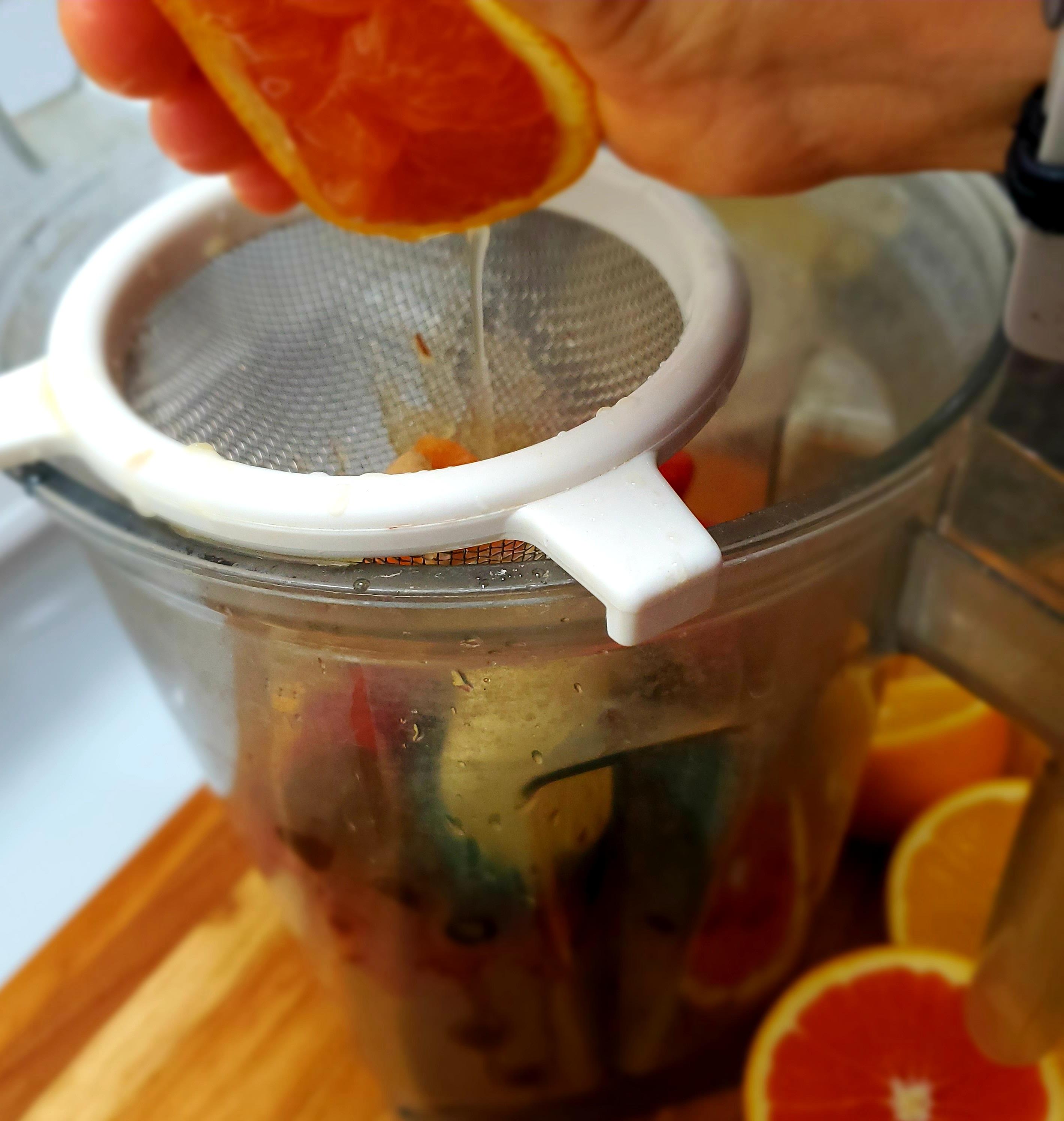 Place all of the ingredients in a blender. Preferably place all the frozen item in first to assure they get fully blended without over blending the smoothie. It is also better to place all the whole foods in before the liquid to avoid any unwanted splatter. When using fresh oranges I like to save time by just squeezing the juice straight into the blender. If your oranges have a lot of seeds, make sure to use a strainer (as shown below). If I’m using fresh, not frozen fruit, I sometimes add 1-2 cups of ice to give the smoothie thicker consistency. Totally up to you though.