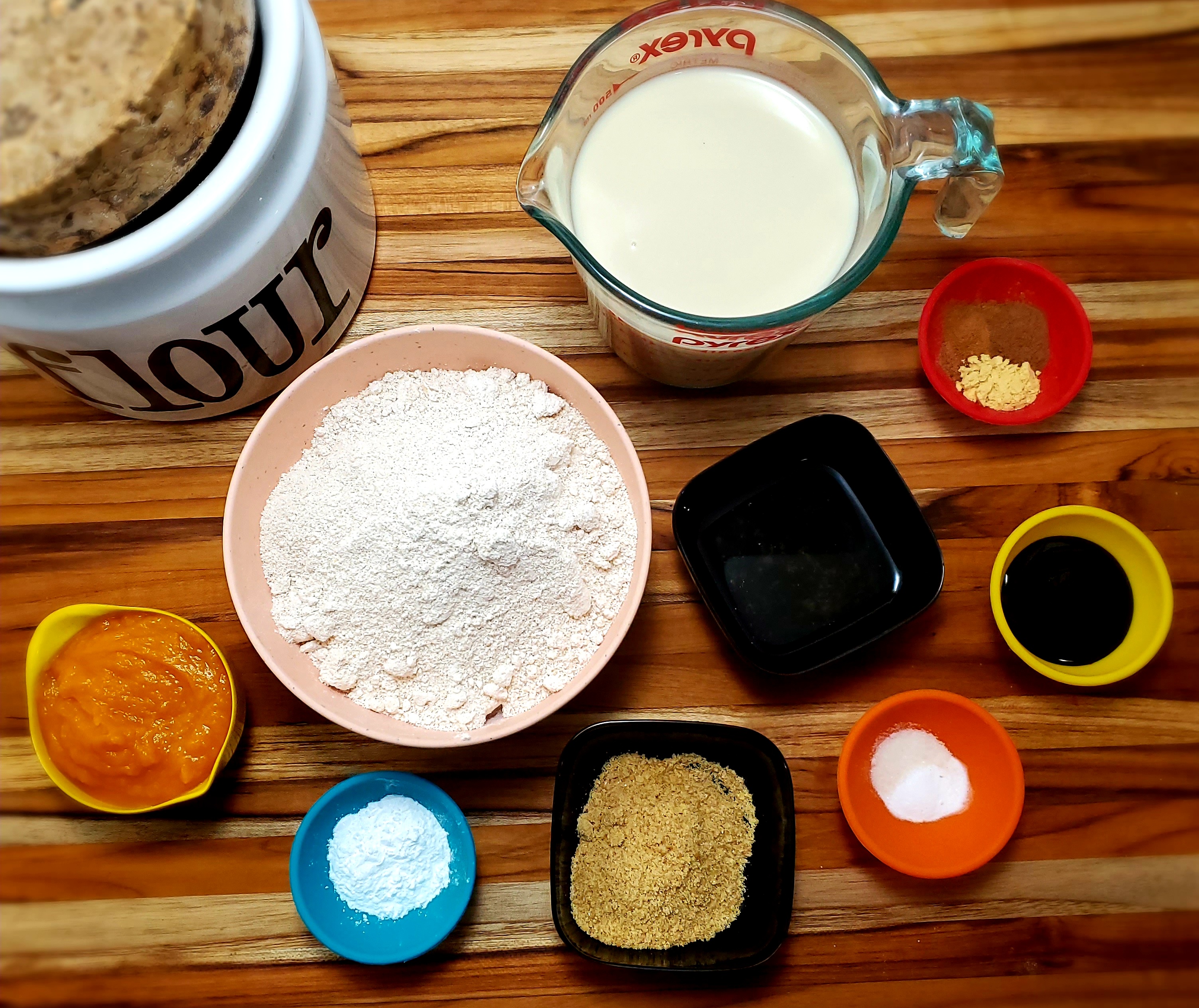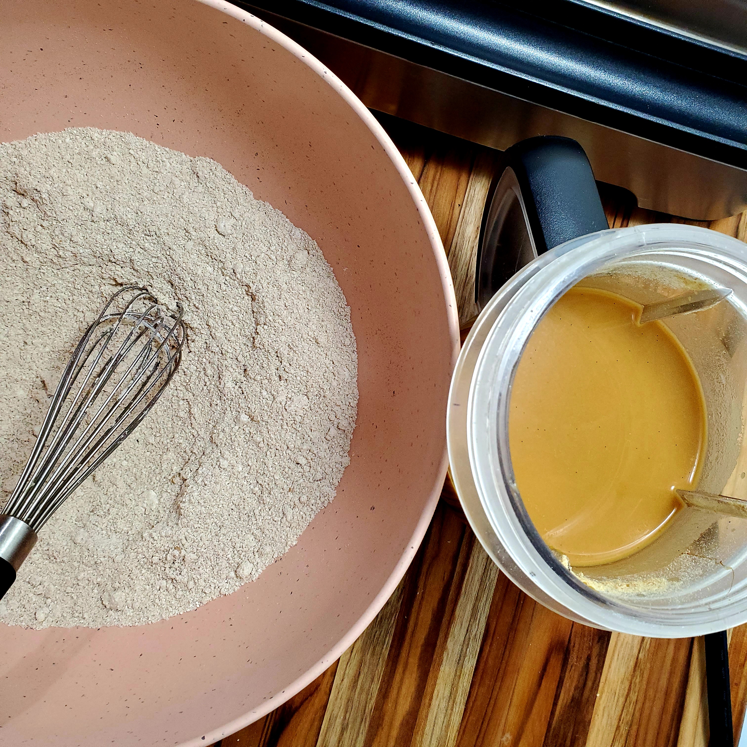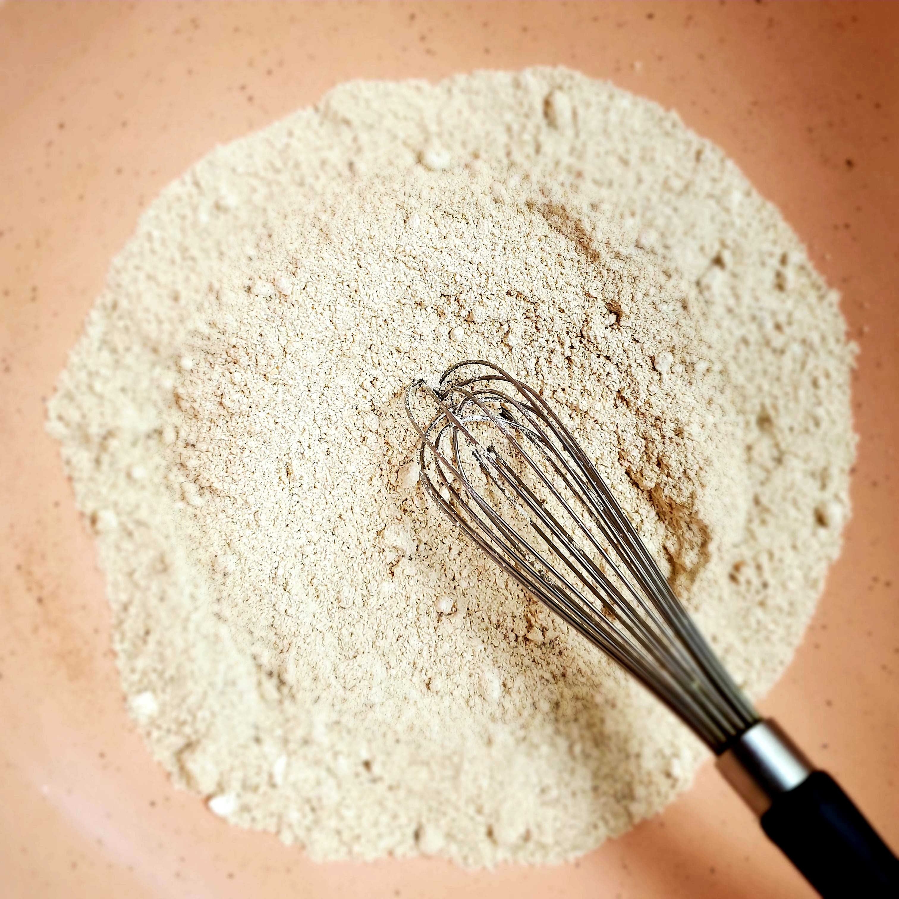 In a medium bowl, whisk first 9 ingredients together. Set aside while you combine the wet ingredients.
