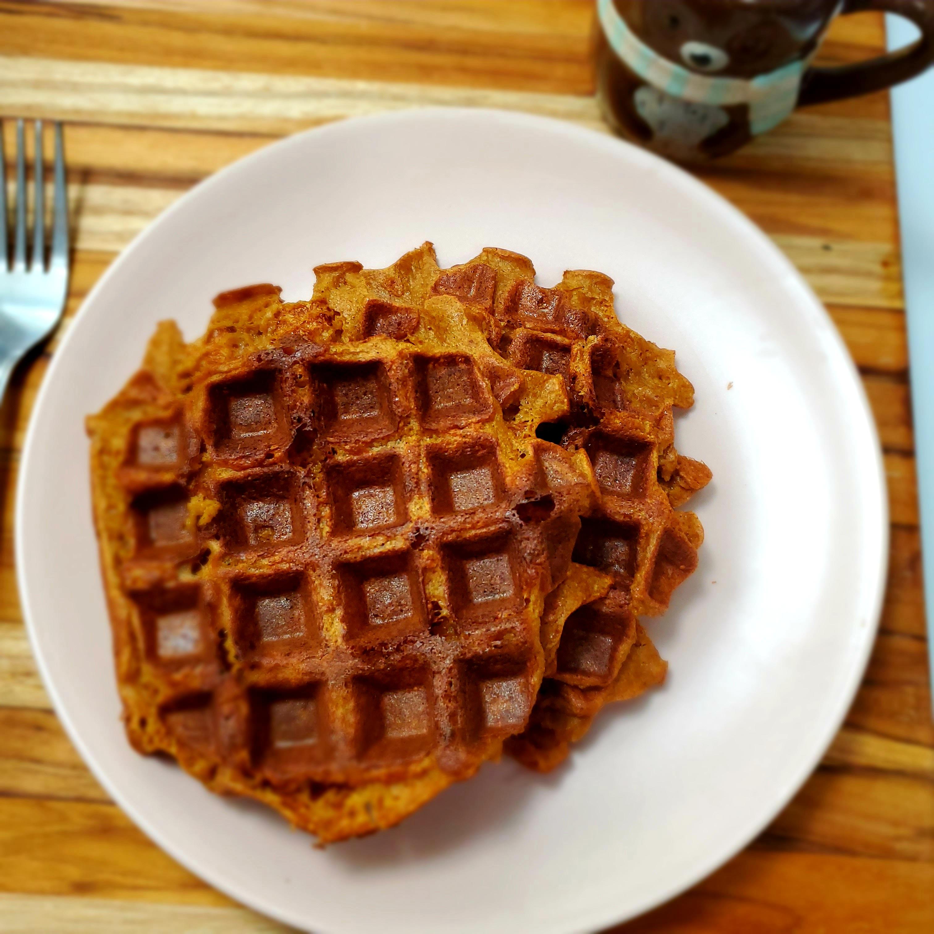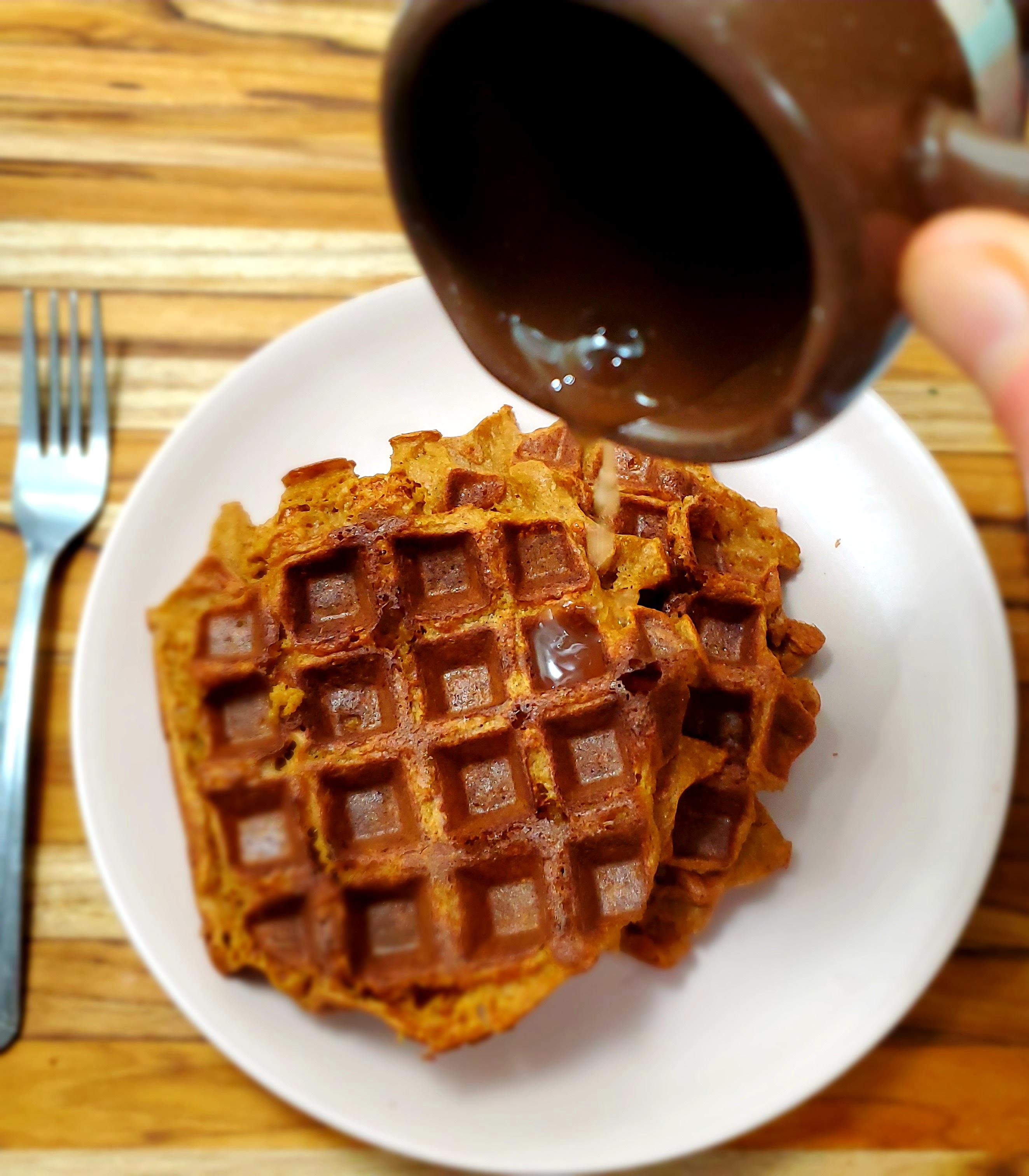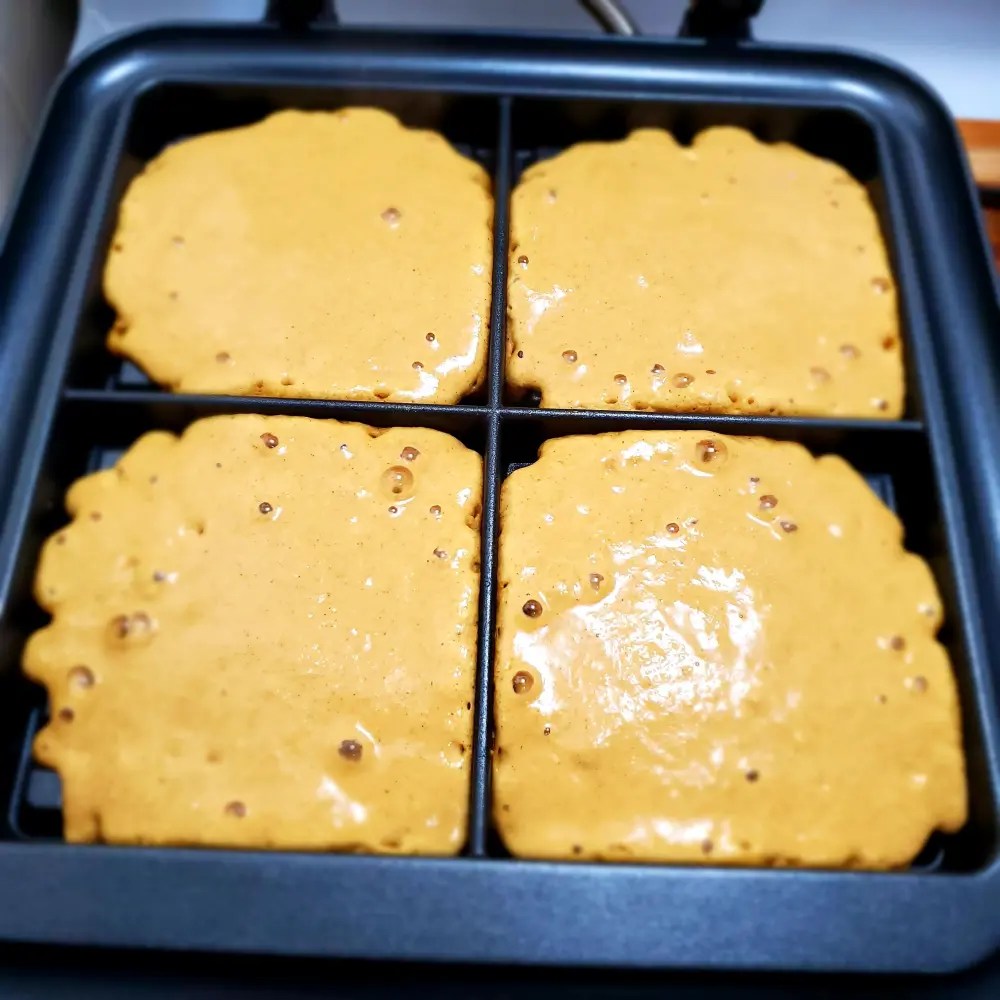 If making waffles, spray preheated waffle iron and add 1/4 -1/2 cup of batter depending how big your iron is. Remember, the batter will spread so if you don’t have much space to work with, use less batter. My waffle iron bakes in 5 minute intervals and that’s usually enough time to make nice golden waffles. Most machines have their own timing so I would just follow instructions for your specific machine. Repeat until all of the batter is gone.