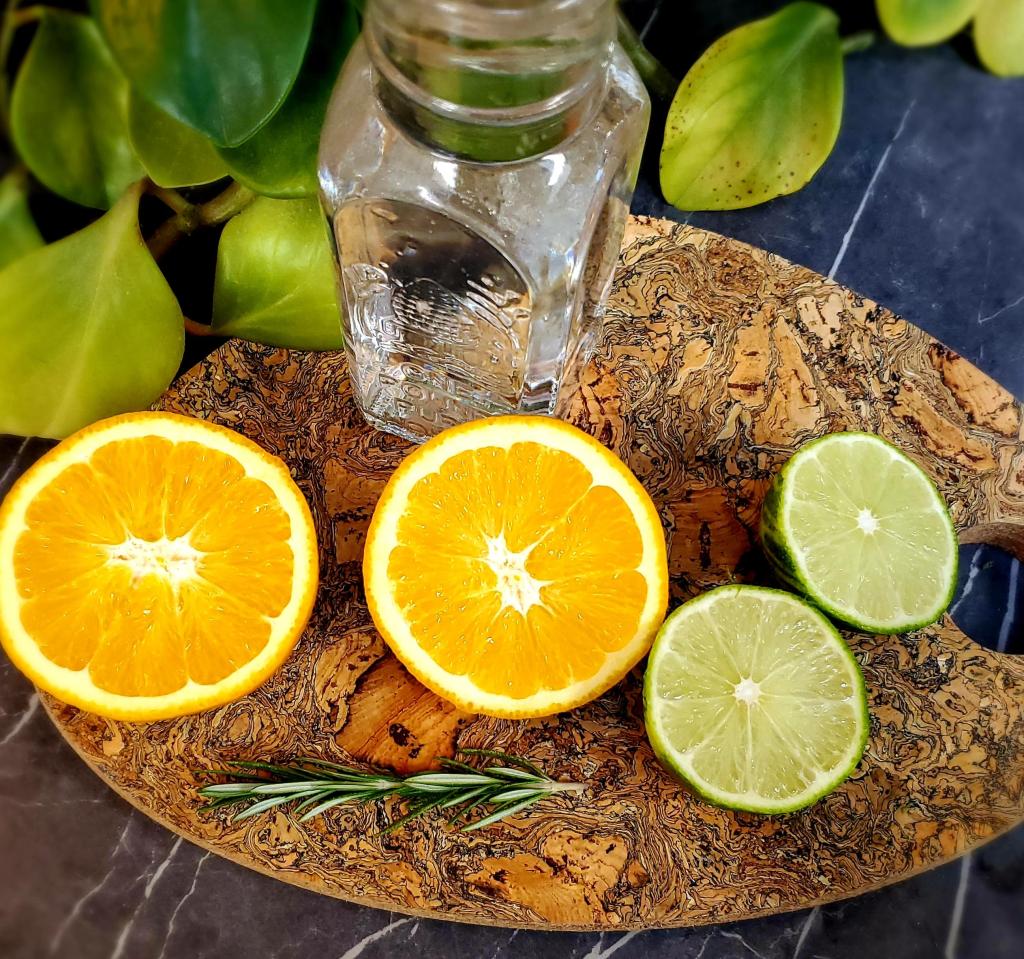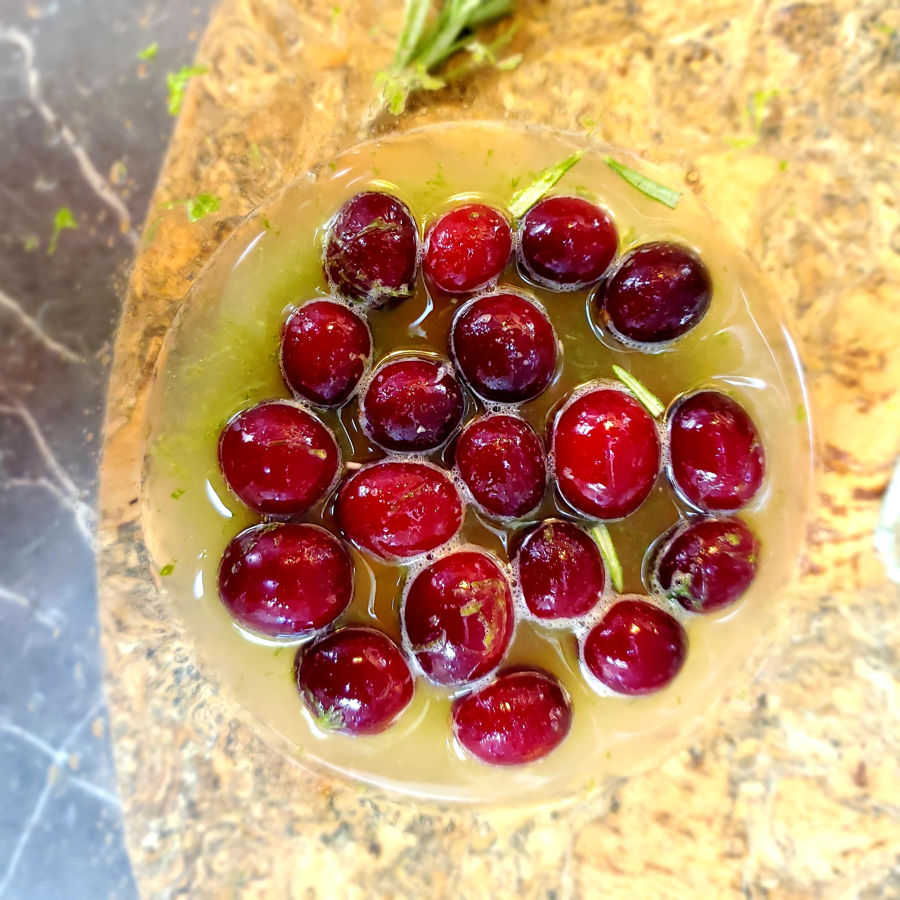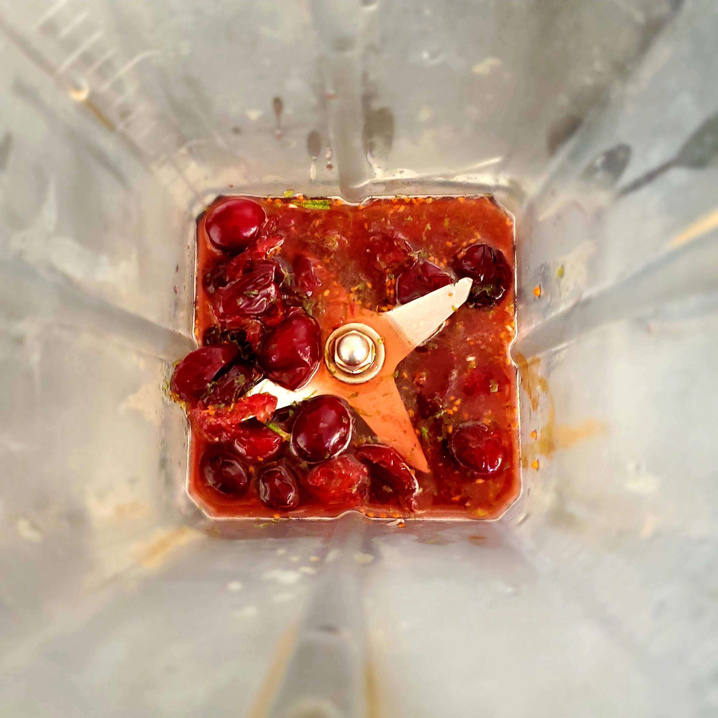 There are 4 options below on how to blend your base syrup. For the first 3 options, in a small bowl, add ¼ cup of cranberries, lime zest and juice, orange juice, rosemary sprig halves, and maple. Using mortar gently mash the cranberries until everything is broken down. Option 2 is to mash everything with a fork and 3 is to get right in there and crush everything with your hands. Option 4 is to blend everything in a blender until the cranberries are fully broken down.