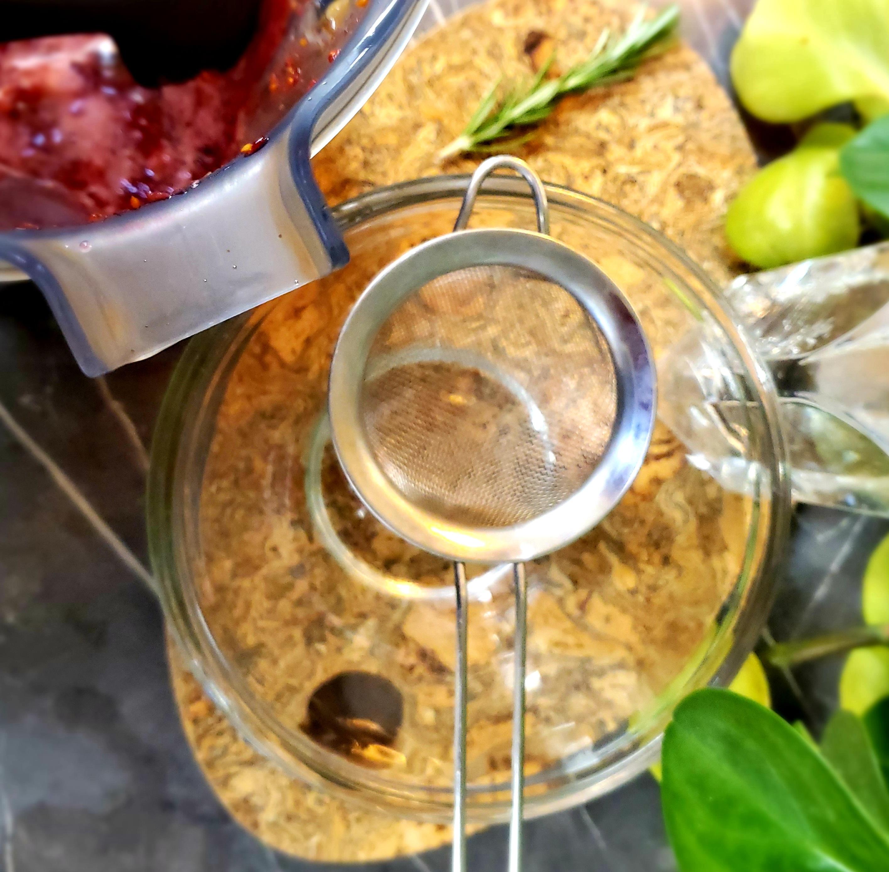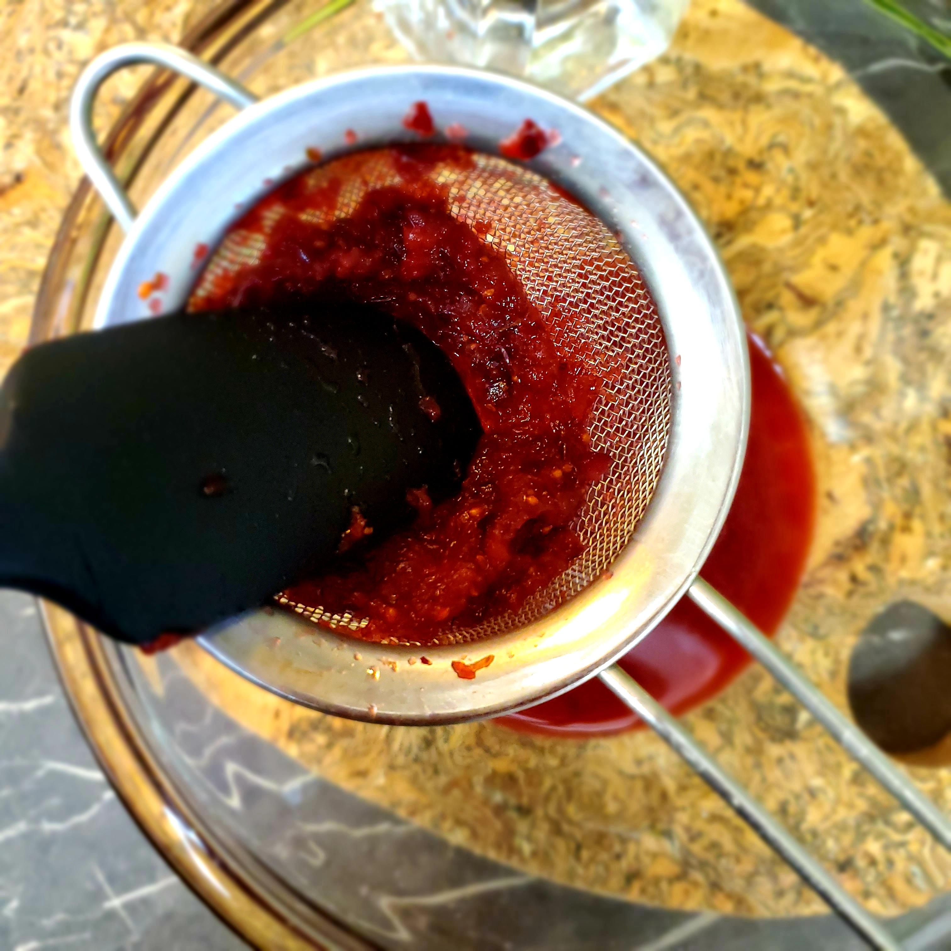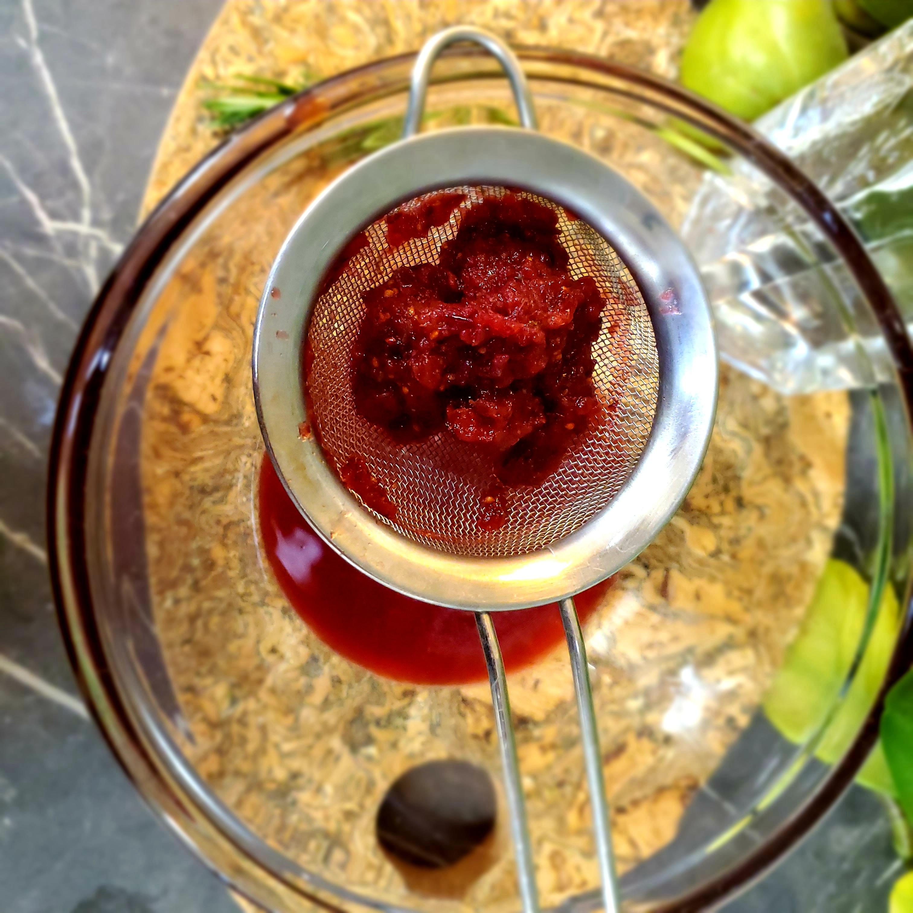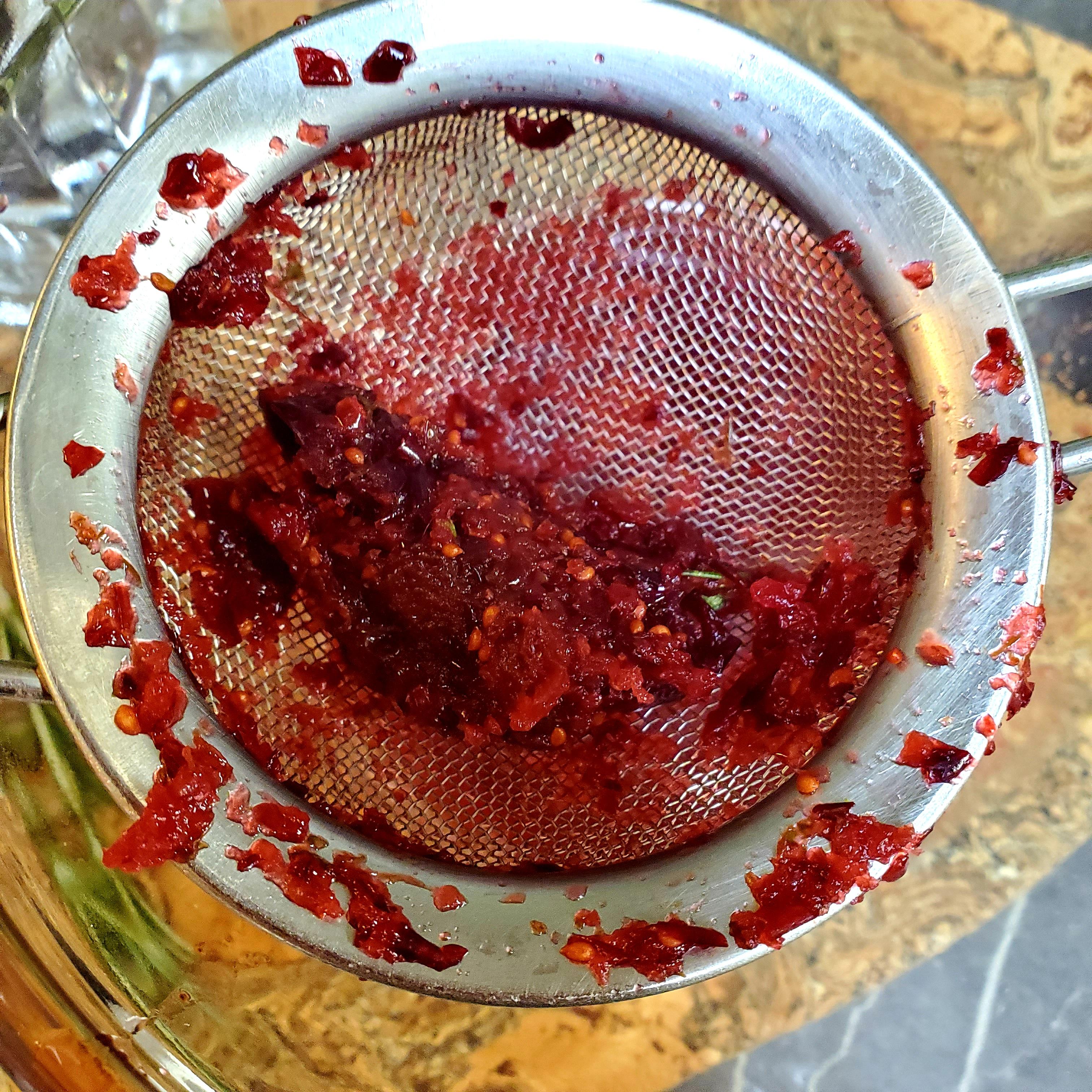 Place a strainer over a bowl and pour the mashed up cranberry mixture into the strainer. Strain the mixture to separate the pulp from the juice. Gently press the pulp with the back of a spoon or spatula to help remove all the juice. You can eat the leftover pulp or discard it. It also goes well in a smoothie.