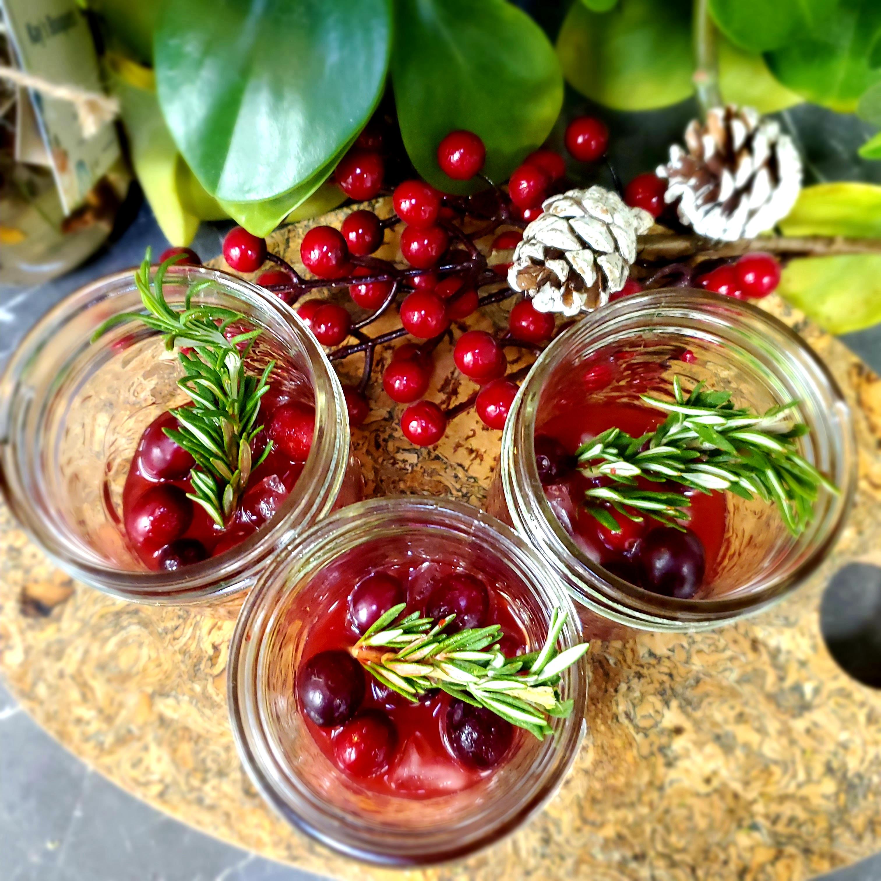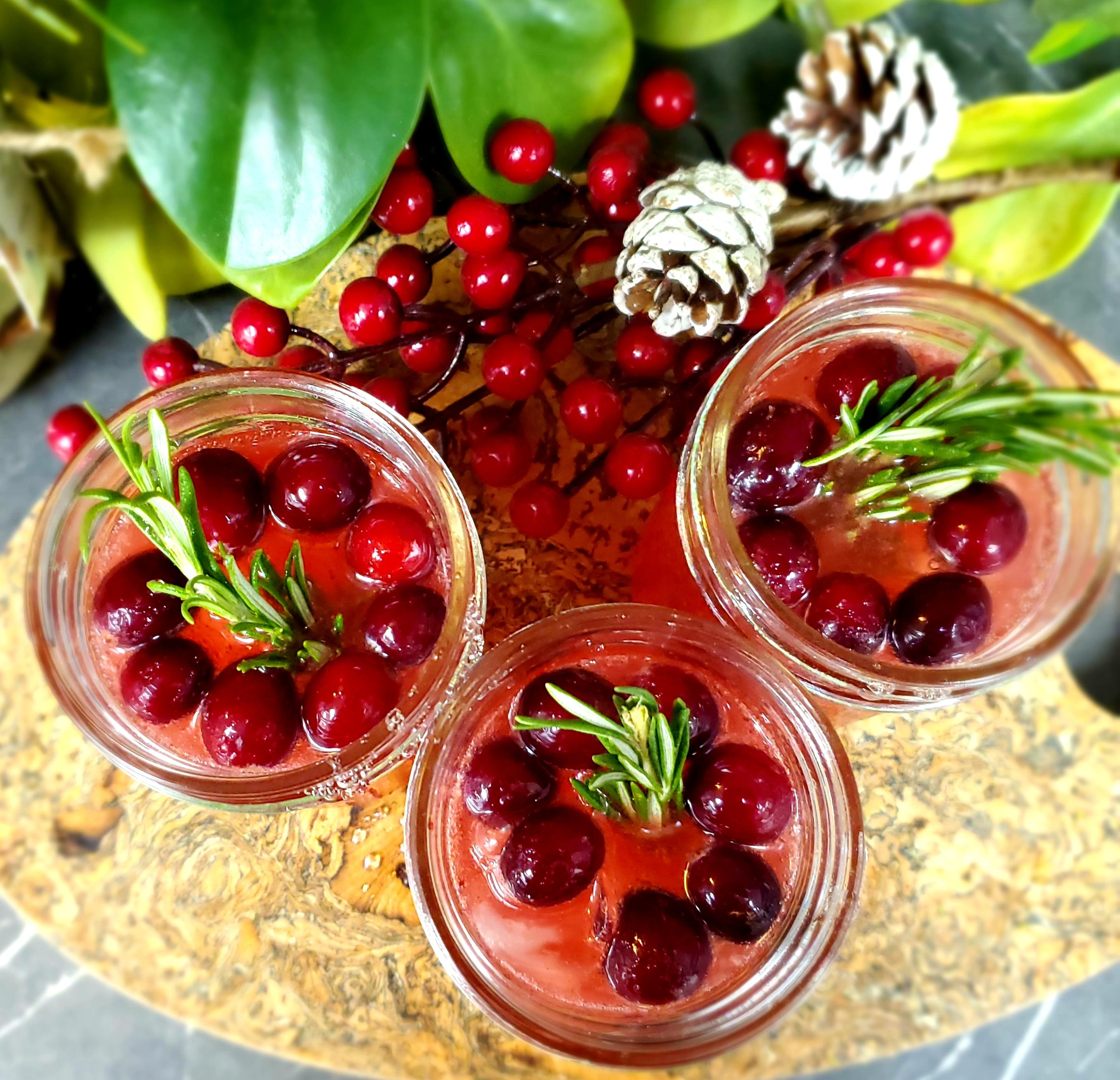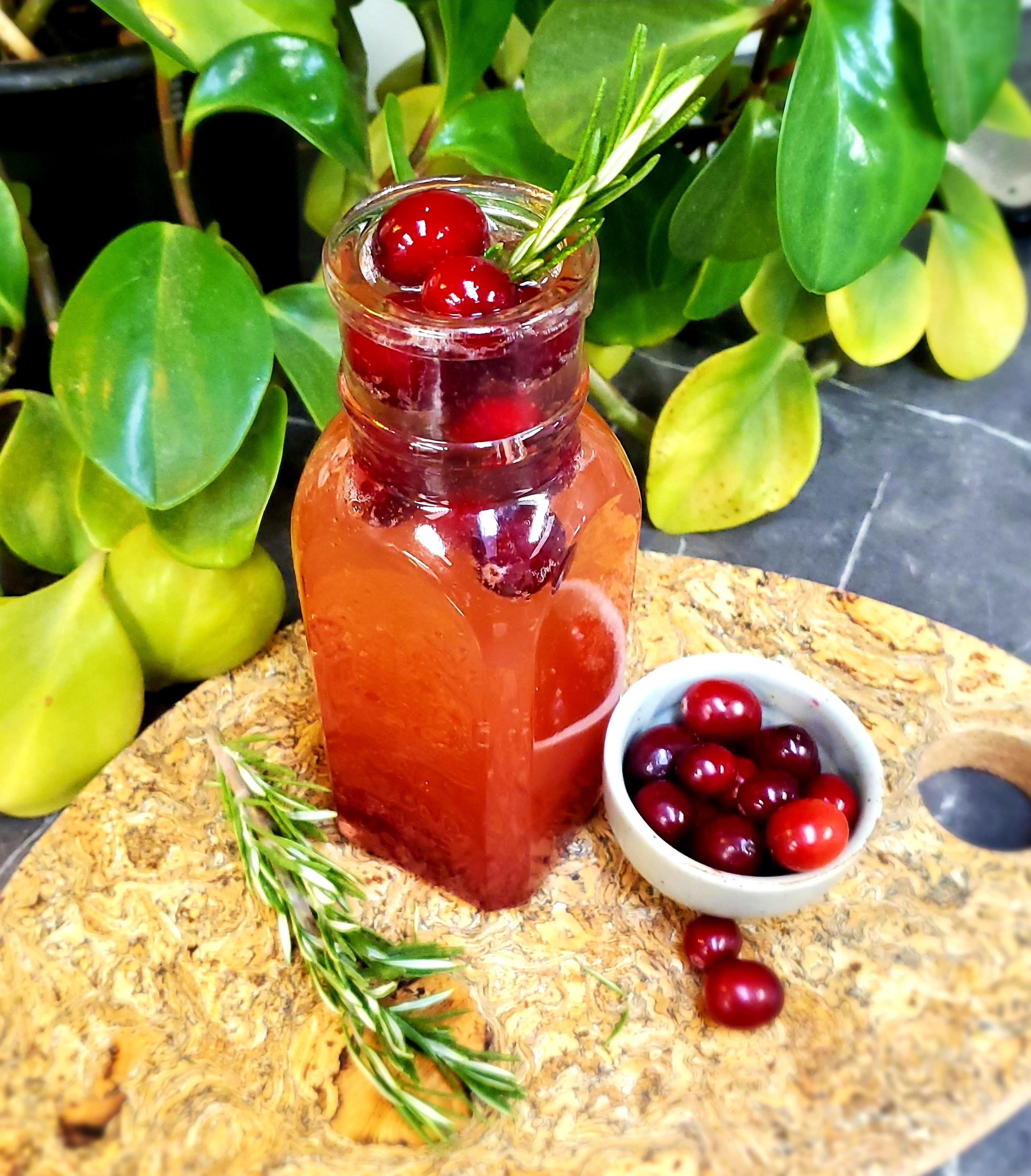 Divide syrup between glasses and top with the sparkling water. Garnish with remaining 1/4 cup of cranberries and a rosemary stem. You can serve this spritzer over ice or use frozen cranberries as the ice. Serve immediately.